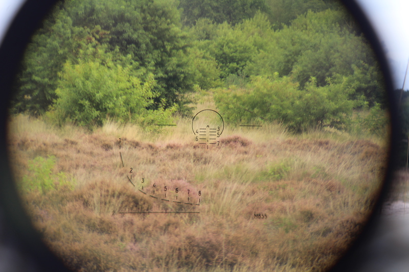 Absehen gegen den freien Himmel. Die Teilstriche sind auf Entfernungen skaliert. Die Skala wurde auf die Flugbahn der 5,56 x45 NATO eingerichtet. Links unten eine Messskala für 1,7 m große Ziele. Das Bild hat einen für russische Optiken typischen Gelbstich. Der kommt von der Vergütung und erleichtert dem Auge das Fokussieren in der Dämmerung.