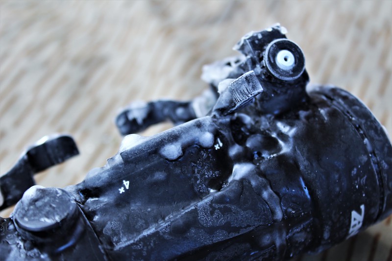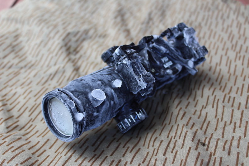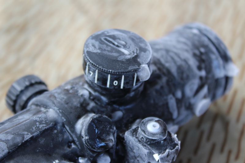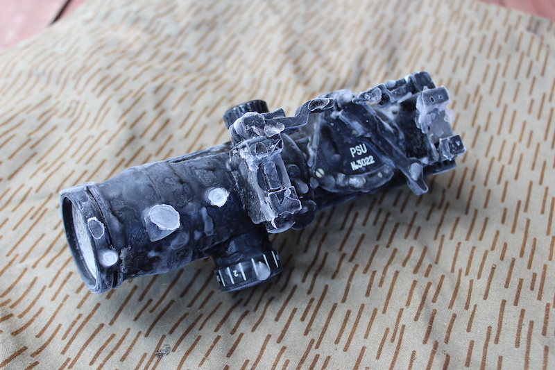 Aber das reicht uns noch nicht. Wir frieren das PSU für 6 Stunden bei -40°C ein. Alle 30 min wurde die Optik mit Wasser besprüht. Ein dicker Eispanzer umgibt nun das Gehäuse und die Funktionsteile. Der Vergrößerungshebel und die Verstelltürme sitzen bombenfest. Die Linsen sind angelaufen. Scheinbar geht nun nichts mehr. Denkste!. Ein sanfter Schlag mit einem Magazin auf den Hebel und die Wärme der Finger auf der Linse reichen, um wieder volle Verwendungsfähigkeit herzustellen!