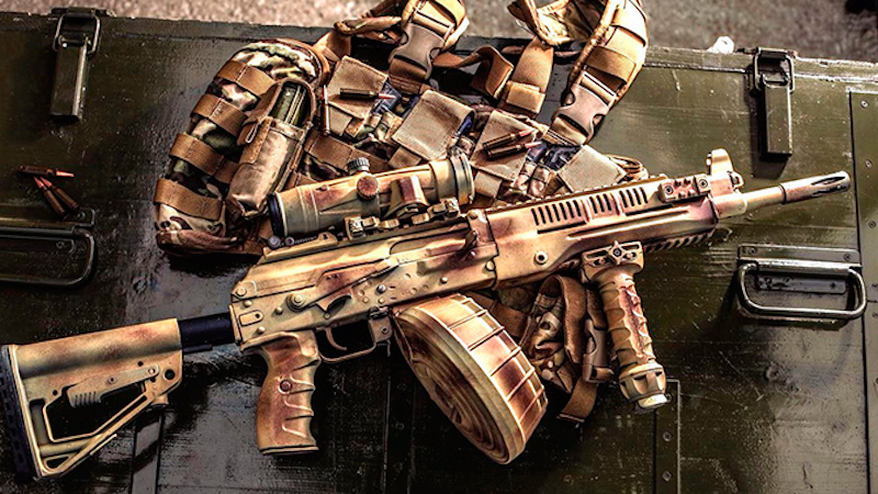 RPK 16 abgetarnt und mit montiertem PSU – gute Sicht für den Nahkampf mit dem leichten Maschinengewehr für die Spetsnaz, mit einem Hebelgriff kann die Optik aber auch für die Ferne brauchbar gemacht werden.