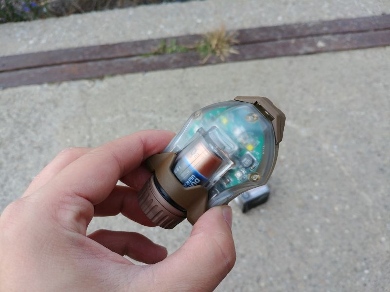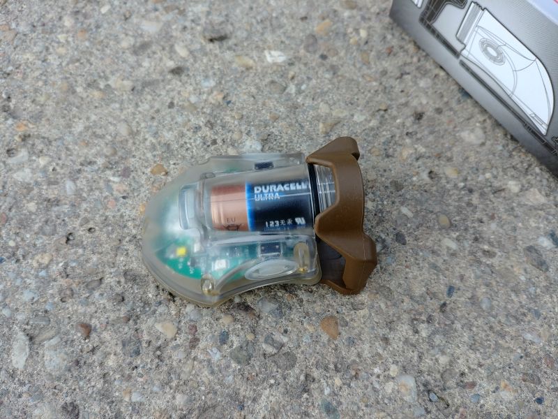 Die Batterie – 3V CR123A – kann dann einfach entnommen werden. Ein Wechsel ist daher gänzlich ohne Werkzeug möglich und das ist auch gut so. Gewechselt werden muss aber sowieso erst nach 120 Stunden Laufzeit. Oder erfahrungsgemäß vor jedem Einsatz, damit immer frischer Saft im Gerät ist.