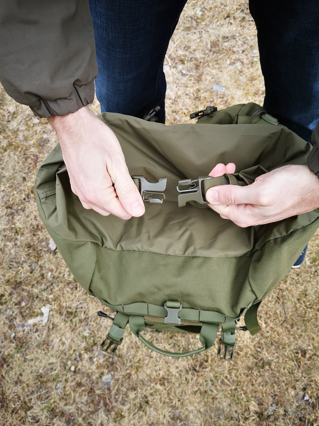 Der Base Pack ist ein klassischer Top-Loader mit Rollverschluss. Die Steckschließen sehen etwas anders als normale aus. Sie sind sozusagen Zwitter, halb Männchen hab Weibchen, was die Schnallen Terminologie angeht.