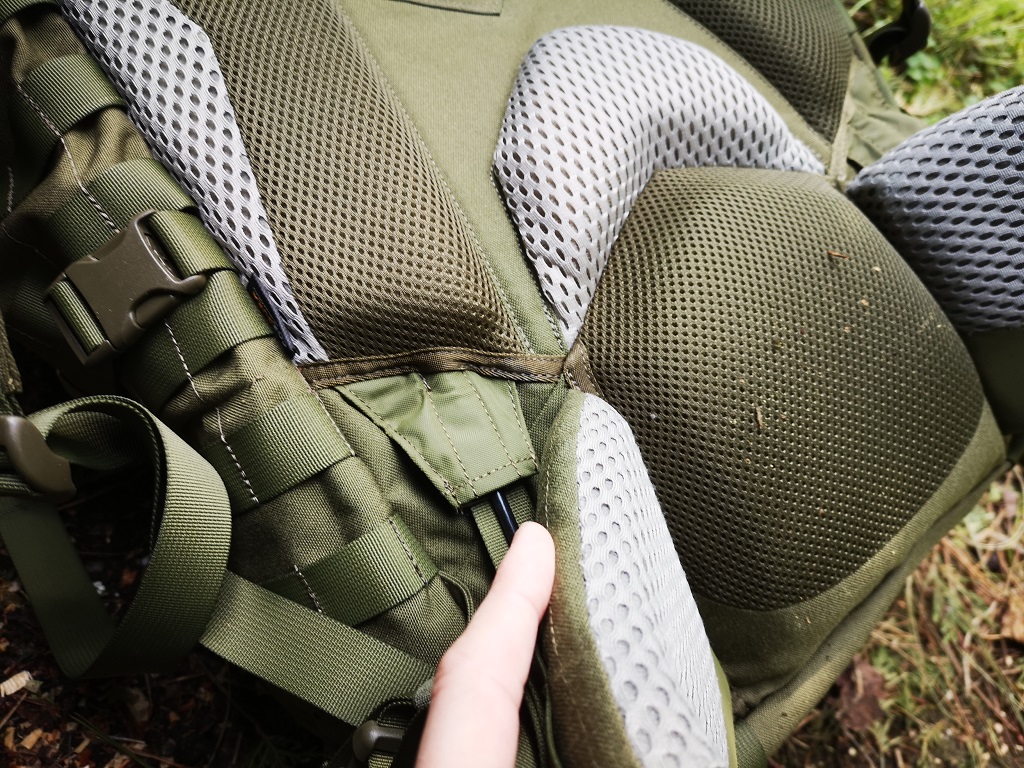 Das Hauptfach selbst ist eher unspektakulär. Oben mittig gibt es einen Klettschlaufe und Öse für den Trinkbeutel, am Rücken ein Einschubfach und an beiden Seiten je einen MOLLE-Klettstreifen für etwas Inneraumorganisation. Simpel aber effektiv