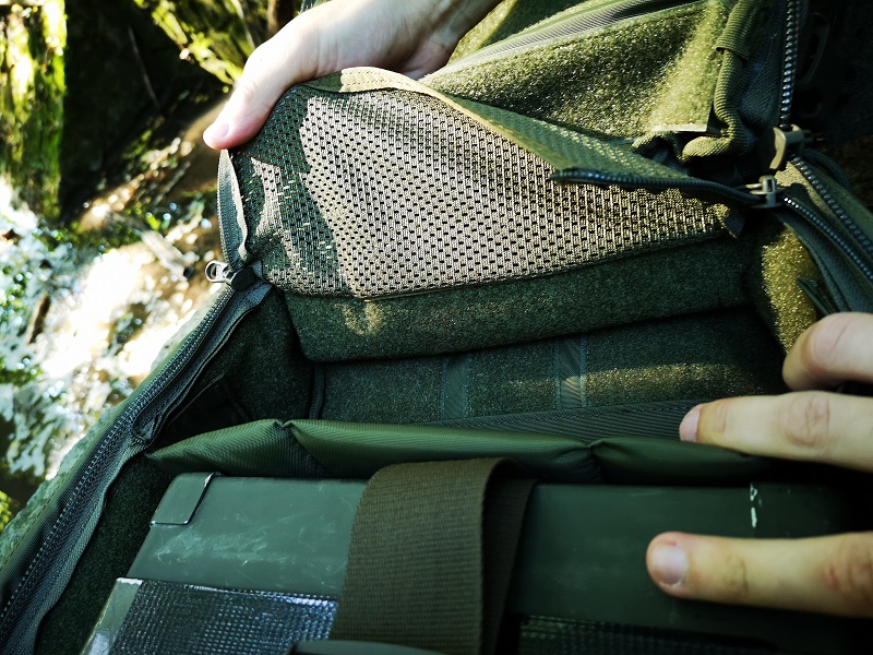 Als Rückensystem wird hier das Padded Back-System verwendet. Eine sehr simple Konstruktion. Eine ausgesteifte Rückenplatte befindet sich im Inneren und stabilisiert den Modular Radio Pack gut.