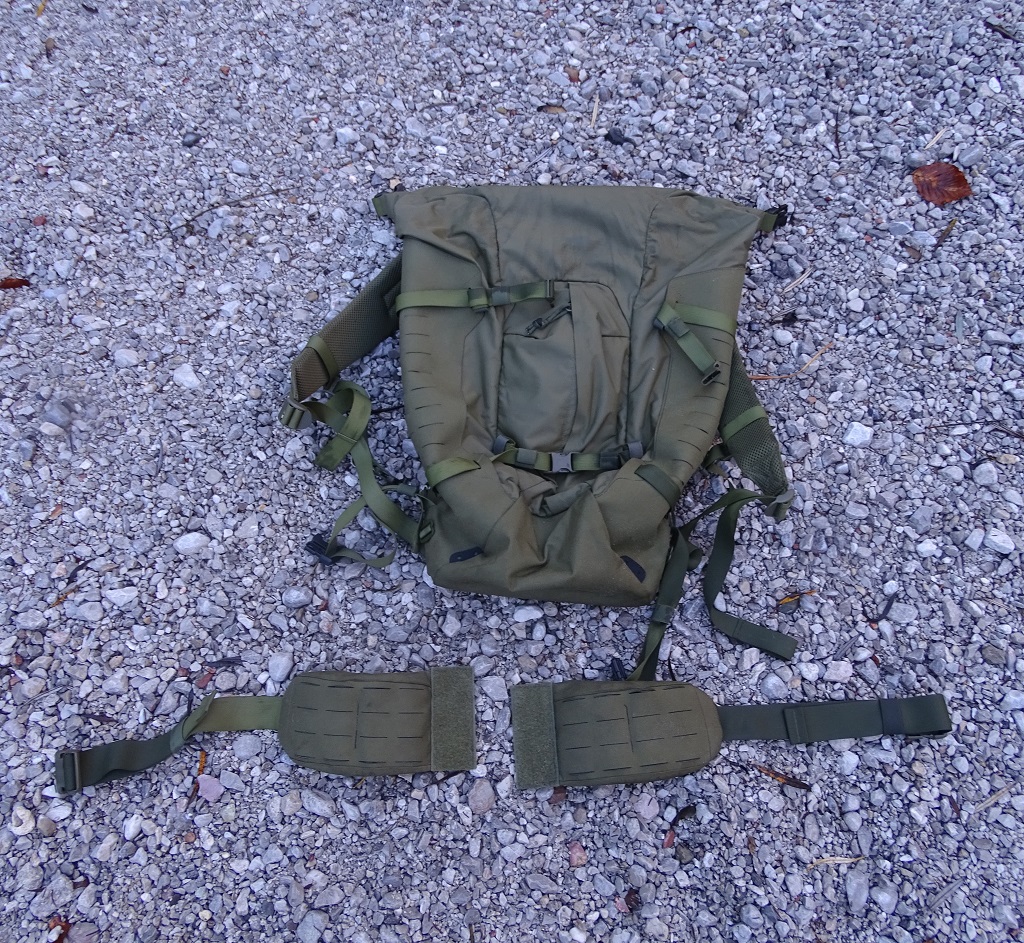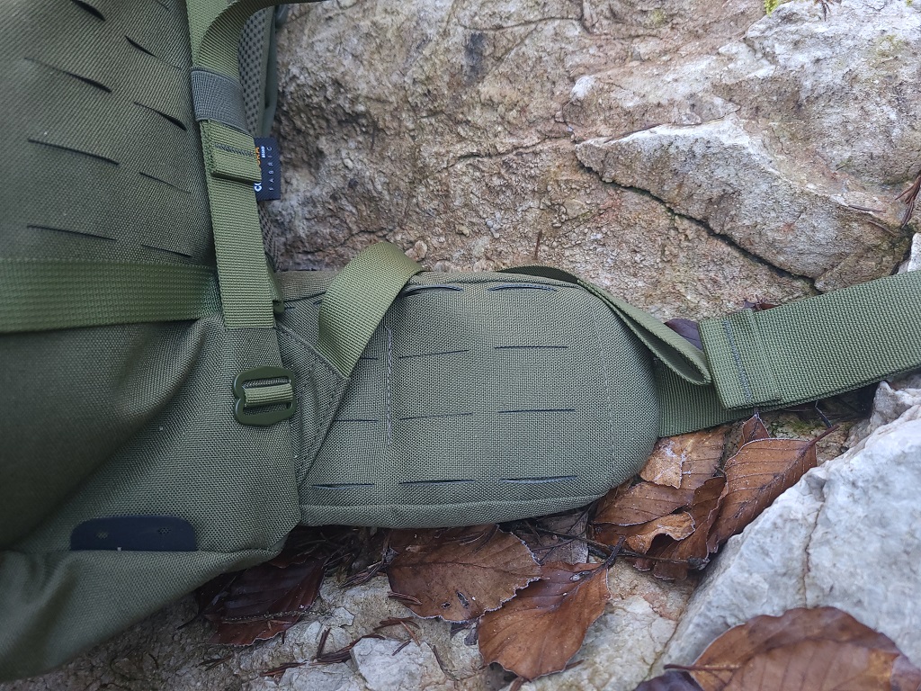 Die gepolsterten Hüftflossen sind mit drei Lasercut MOLLE Reihen versehen und verstellbar in der Weite.