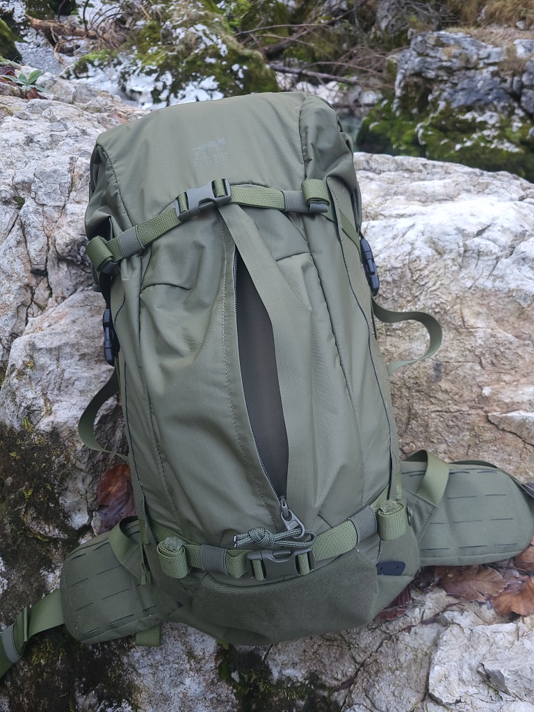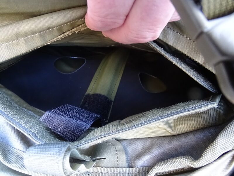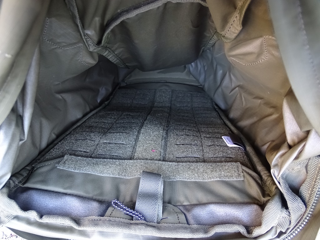 Über einen Einweg-Reißverschluss von YKK im Roll Top kommt der Anwender in das Hauptfach des TT Sentinel 28. Im Inneren des Rucksacks befindet sich eine 34 cm x 25 cm großer Klettbereich, welcher mit Lasercut MOLLE/PALS versehen ist. Eine Aufhängung für eine Trinkblase befindet sich oben, darunter ist der Durchlaß für den Trinkschlaub oder Kabel.