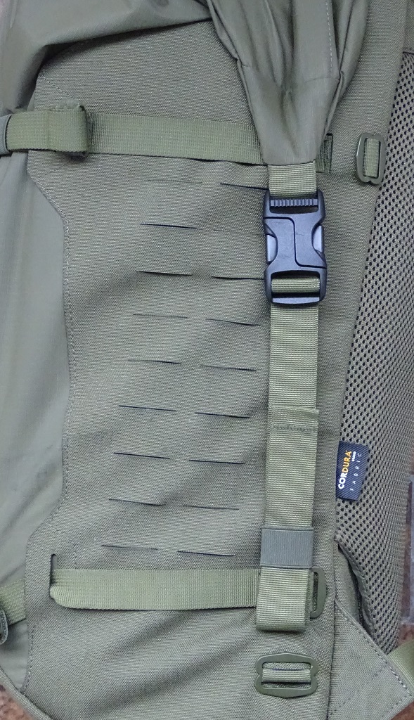 Die zwei vertikalen Kompressionsriemen sind mit stabilen Wojin Verschlüssen versehen und mit Klett am Riemenende, um den Rest vom Riemen aufzurollen und zu fixieren, damit dieser nicht herumbaumelt. Beide Riemen werden durch Lasercut Schlitze geführt, was zu einem flacheren Profil führt. Am Ende der Riemen sind Leiterschnallen aus Metall angebracht. Die Kompressionsriemen können komplett ausgebaut werden.