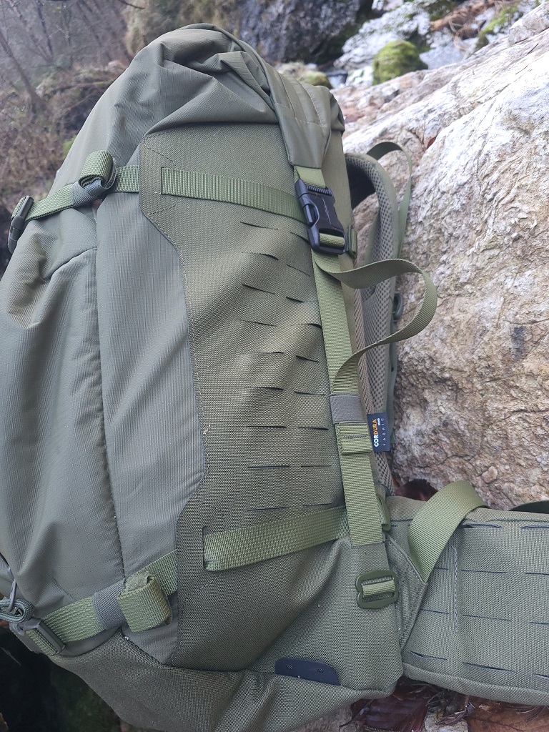 An der linken und rechten Seite des TT Sentinel 28 kommt das T-Square Rip FD zum Einsatz, dadurch wird der Rucksack stabiler und dort befinden sich jeweils acht Lasercut MOLLE Reihen zum Befestigen von weiteren Ausrüstungsgegenständen und kompatiblen Taschen.