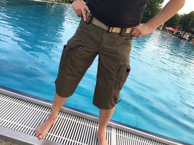 Das Ende der Legende: die P-40 Tactical Shorts gehen über das Knie. Der Deutsche sagt gerne „Capri-Hose“ dazu. Das ist praktisch – es ist Stoff da, wenn man abkniet – aber auch Geschmacksache. Wir kennen Menschen, die bis zur Naht unter der Oberschenkeltasche gekürzt haben. Vielleicht nicht im Sinne der Erfinders, aber gut machbar.