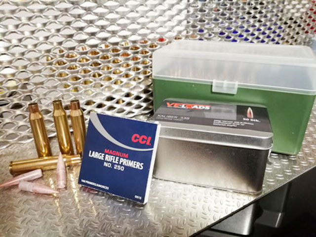 Letztes Wochenende war es dann aber mit den .338 Projektilen soweit. Auch hier haben wir wieder eine Ladeleiter laboriert um zu sehen was die besten Ergebnisse erzielt. Als Pulver kam dabei das N570 von Vihtavuori zum Einsatz. Die Primers waren die „Large rifle primers“ von CCI und die Hülsen waren von PPU.