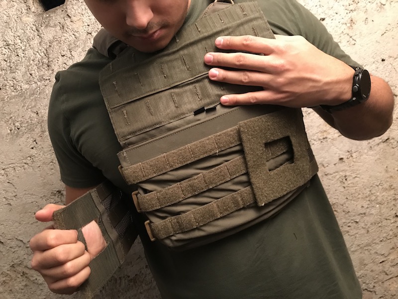 Zieht man die Stretchhülle ab, kommt ein Schulterriemen aus Ultracomp zum Vorschein. Er kann kurz oder lang gestellt werden, ist unten gepolstert und wird mit D-Ringen an den Plattentaschen des Carriers verankert. Die Abdeckung mit Stretch kann auch als Kabeltunnel für die Funke verwendet werden. Die schmale Schulter soll auch möglichst wenig mit den Trageriemen von Rucksäcken oder sonstiger schleppbarer Ausrüstung kollidieren.