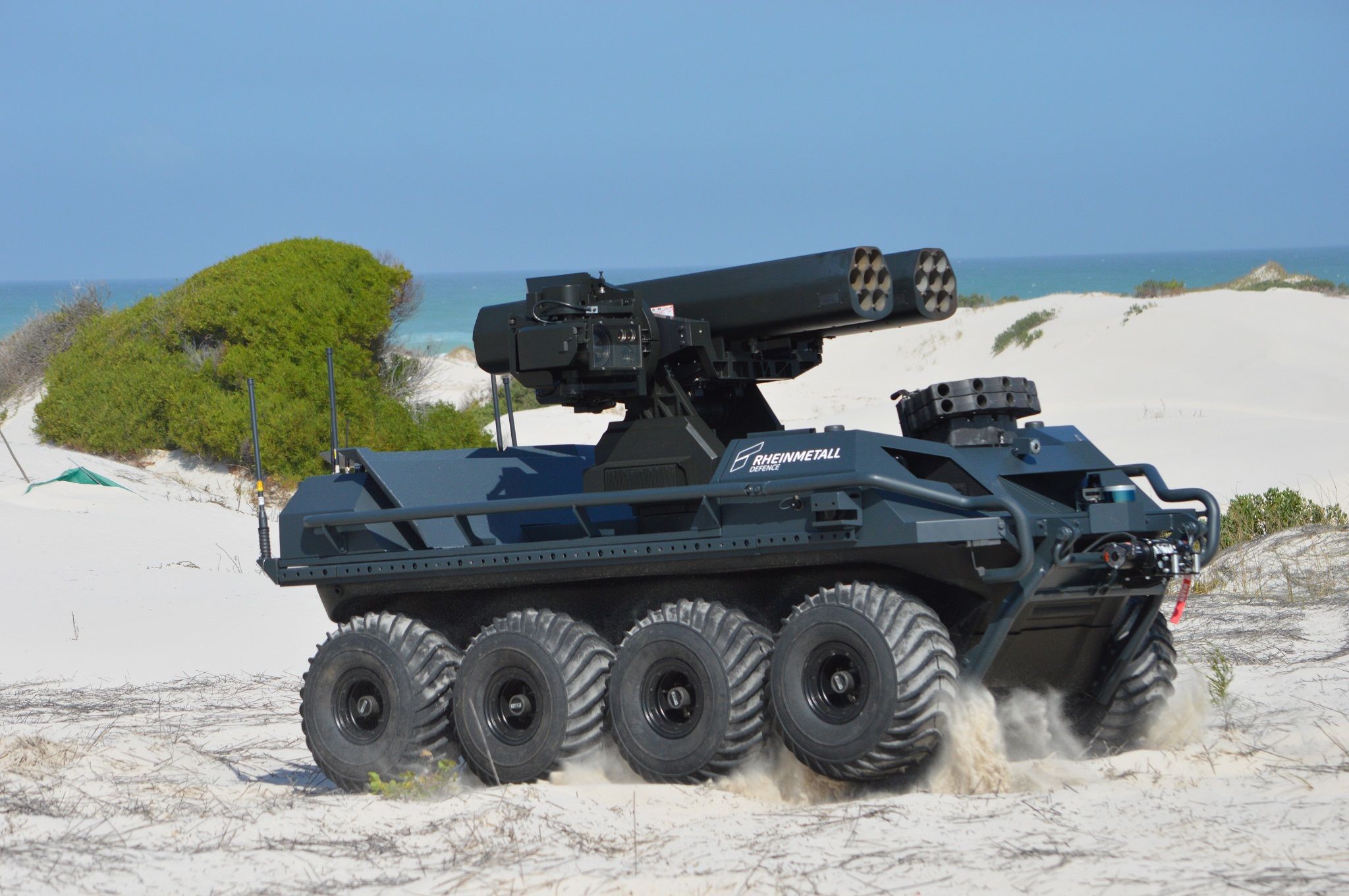 Bewaffnet mit der Rheinmetall Fieldranger Multi Waffenstation mit 70-mm-Raketenwerfern von Thales feuerte der neu entwickelte Rheinmetall Mission Master – Protection eine Salve von 14 Raketen ab. Dabei brachte er 60 kg Sprengstoff in 1,6 Sekunden auf den Weg Richtung Ziel – eine Leistung, die gerade im Landstreitkräftebereich besonders bemerkenswert erscheint. „Wir sind wahrscheinlich die ersten, die ein Luft-Boden-System in einer Boden-Boden-Rolle einsetzen. Definitiv sind wir aber die ersten, die es von einem UGV aus tun“, so Alain Tremblay, Vizepräsident für Geschäftsentwicklung bei Rheinmetall Canada.