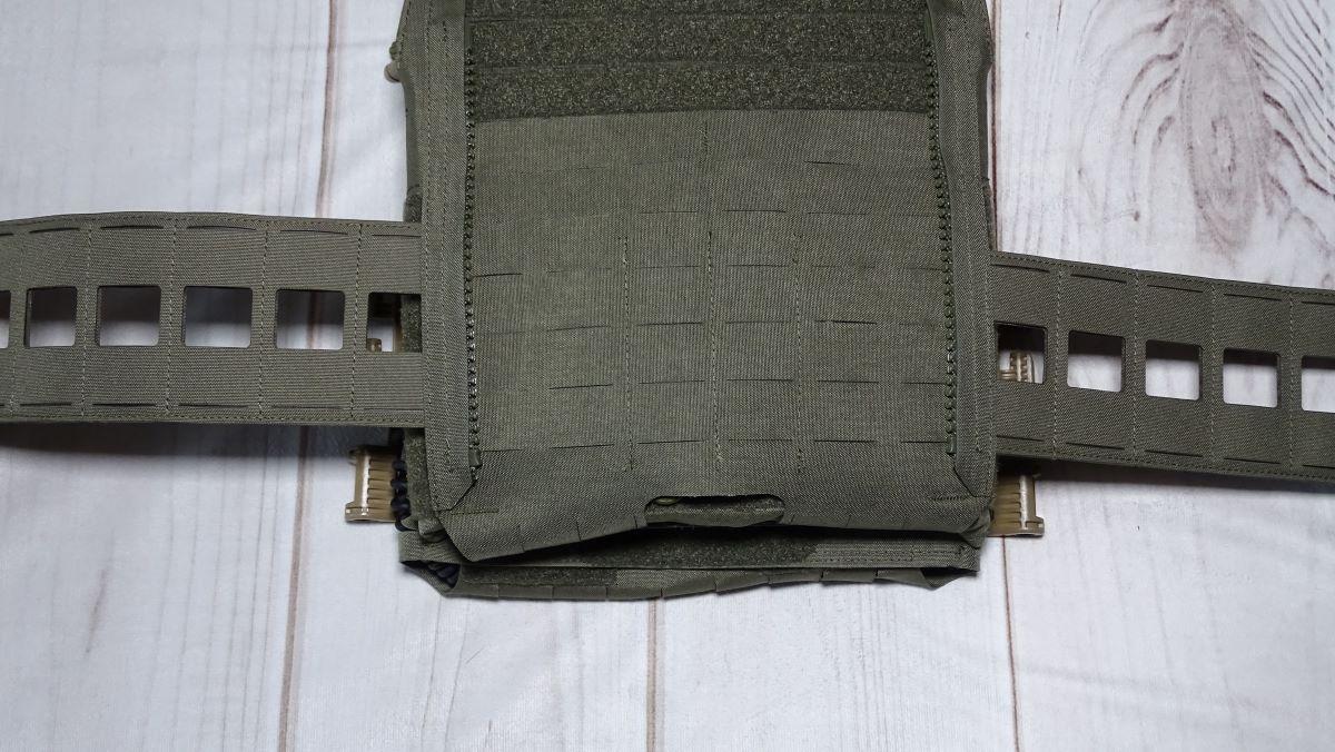 Lasergeschnittene MOLLE-Spalten, die zur Befestigung von Ausrüstungsgegenständen oder zur Durchführung von Kabeln dienen können, befinden sich an den Seiten der Fronttasche. Die Vorder- und Rückentaschen sind im unteren Bereich ebenfalls mit MOLLE-Spalten versehen.