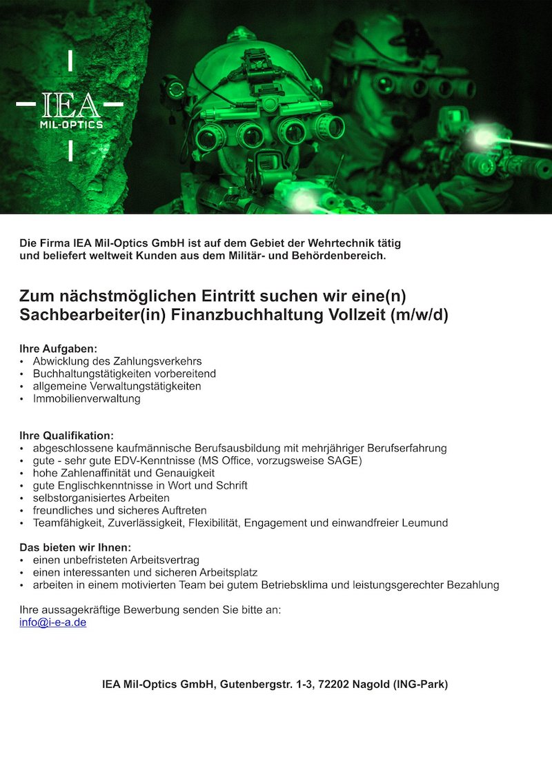 Stimmt es mit der Ausrüstung, stimmt es mit dem Geld. IEA MIL OPTICS sucht einen Mitarbeiter für die Verrechnung.