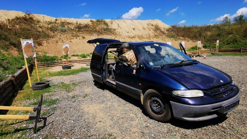 Jetzt ist es endlich soweit und als wir zurückkommen, steht „Schießen aus dem Fahrzeug“ am Programm. Zwei Fahrzeuge wurden geparkt, mit mehrere Zielscheiben daneben.