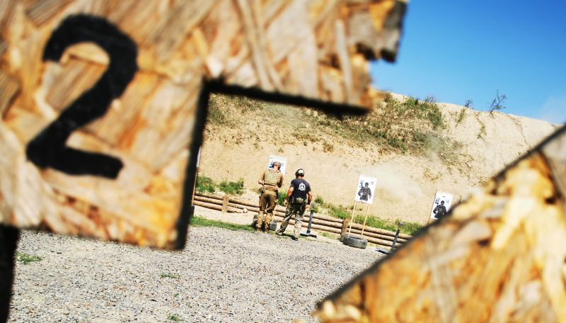 Nach der Mittagspause geht es bei gefühlten 40 Grad weiter mit Schießen bei Bewegung. Zum Einstieg wird die Vorwärts- und Rückwärts-Bewegung während des Schießens geübt. Ein kurzes Trockentraining macht einen vertraut damit und die Instruktoren geben wieder Feedback, wie man am besten die Schritte, sowie Schwerpunkt setzt.