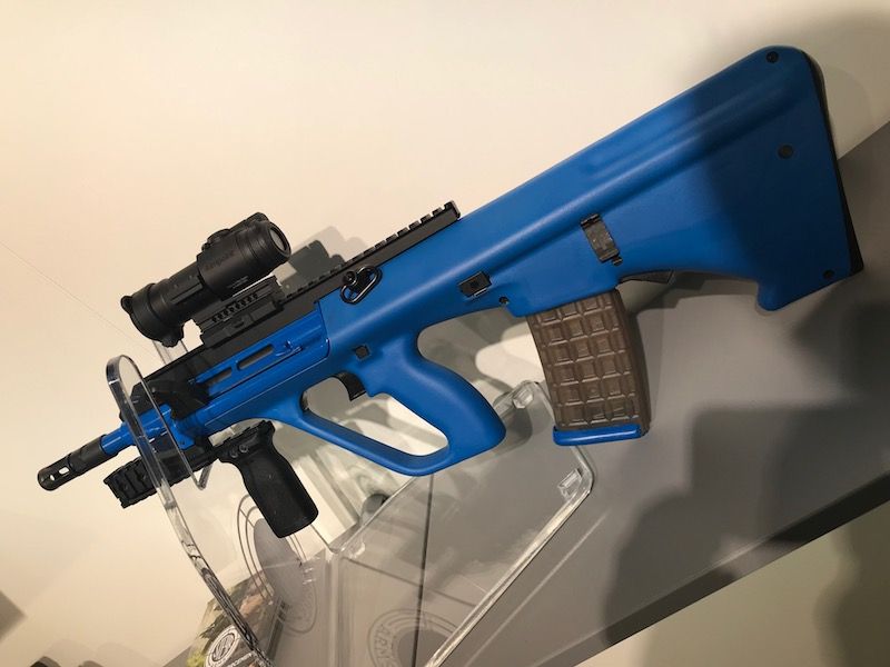 Auf der Enforce Tac hat Steyr Arms nicht nur das neue Sturmgewehr für die Cobra in Österreich im schweren Kaliber .300 BLK gezeigt, sondern auch eine neue Weiterbildungsmöglichkeit. inzwischen hat es sich herumgesprochen, das Sturmgewehre nicht nur herumgetragen und geputzt werden müssen, sondern dass es besonders auf die Skills der Anwender ankommt. Das blaue Steyr AUG mit modernen Rails ist ein Trainer, der wohl mit Simunition betrieben wird. Angesichts zunehmender Gefahren ist es vor allem für polizeiliche Spezialkräfte immer wichtiger möglichst realistisch zu trainieren.