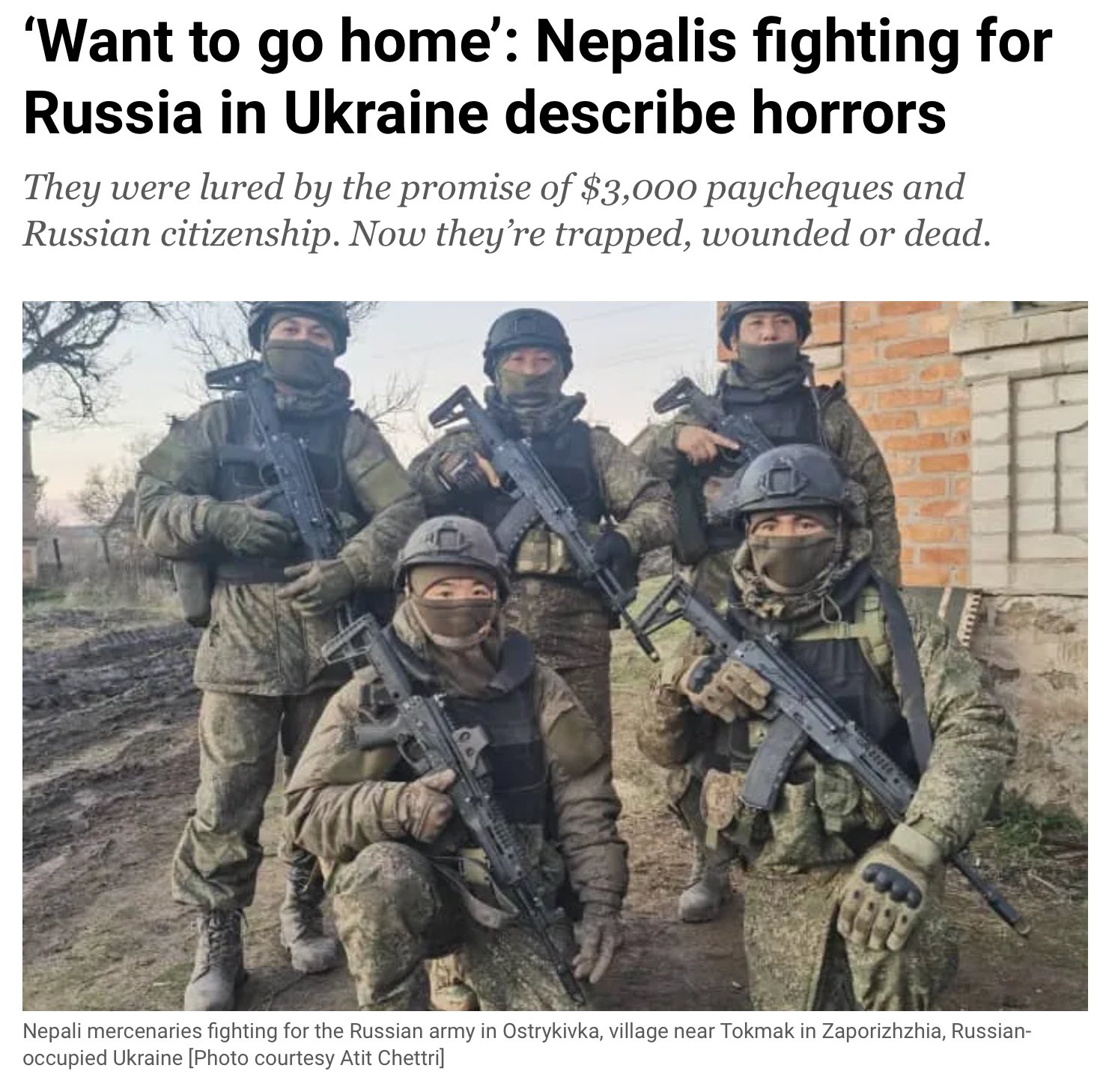 CNN berichtet am 11. Februar, dass Russland bis zu 15.000 Nepalesen für den Kampf in der Ukraine rekrutiert habe, von denen sich viele über die schlechten Bedingungen und das Fehlen einer angemessenen Ausbildung vor ihrem Einsatz an den aktivsten Frontlinien in der Ukraine beklagen würden.