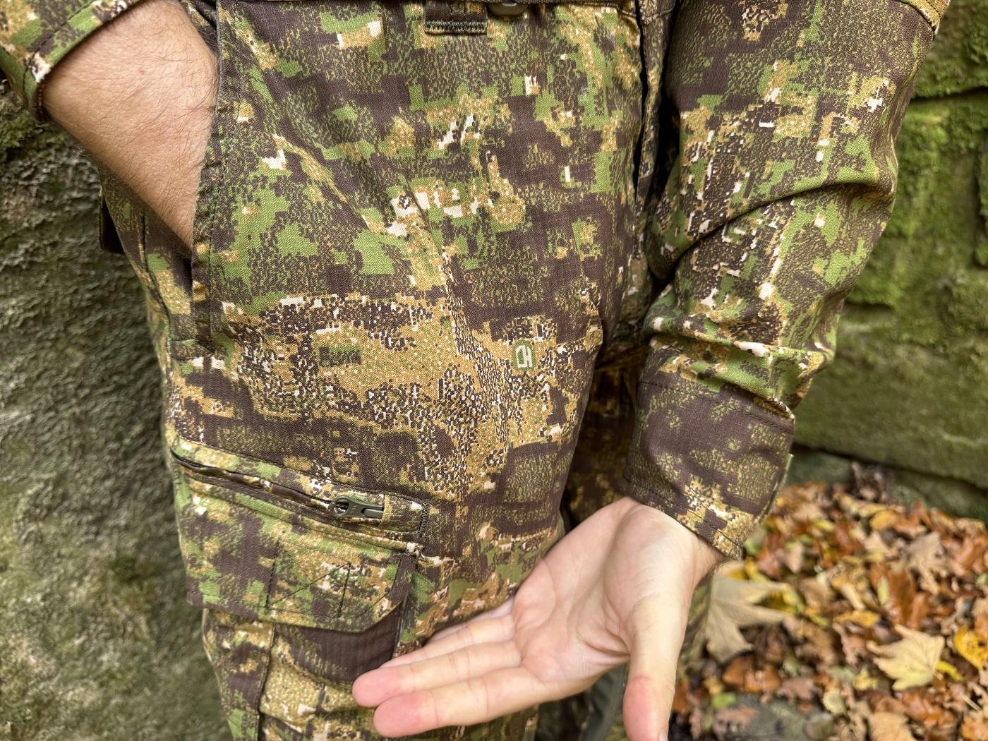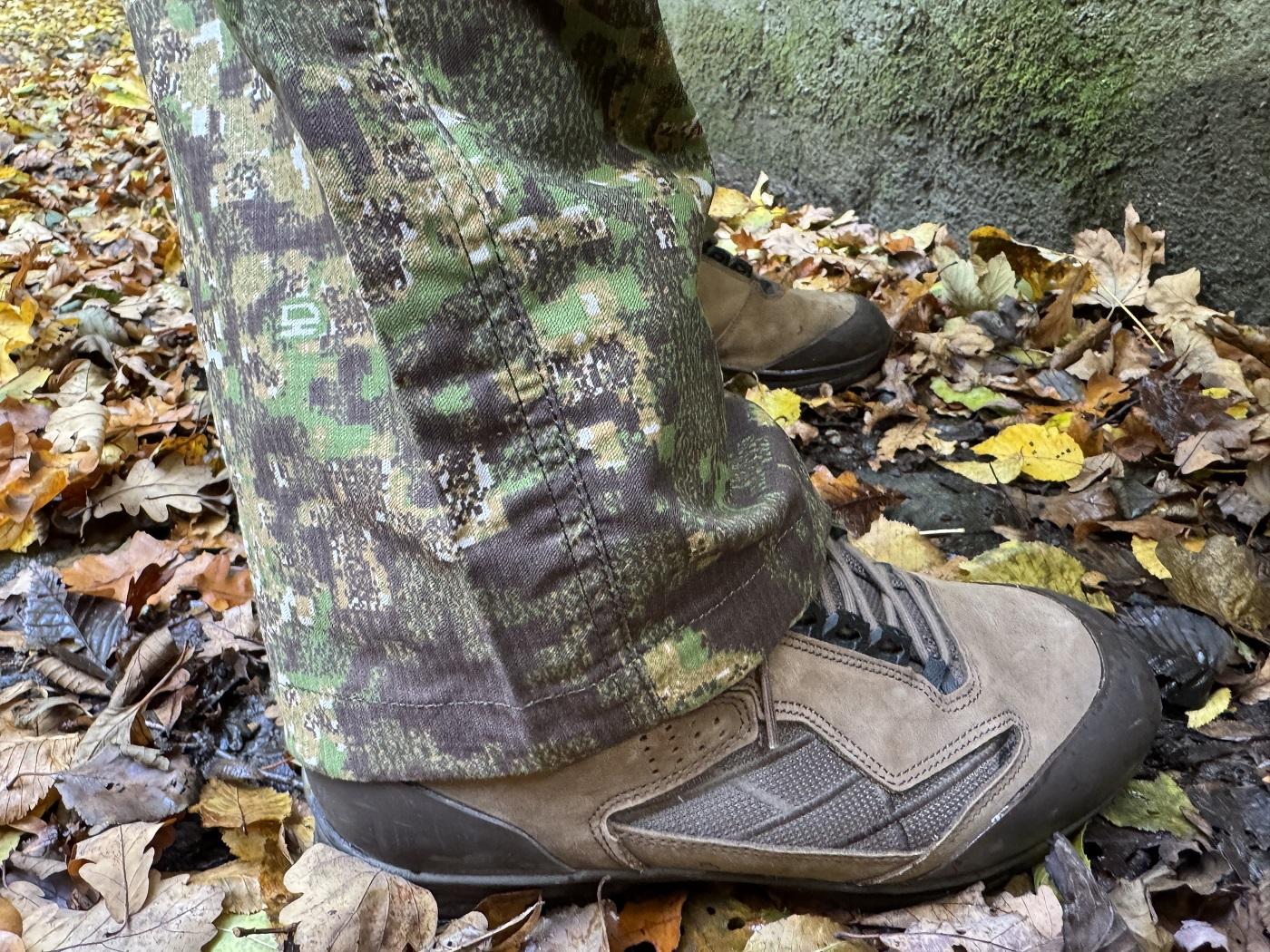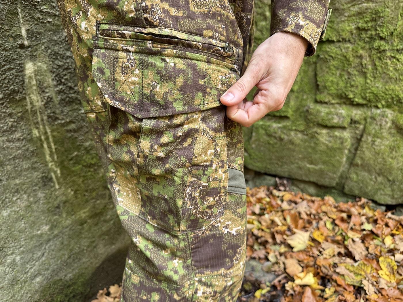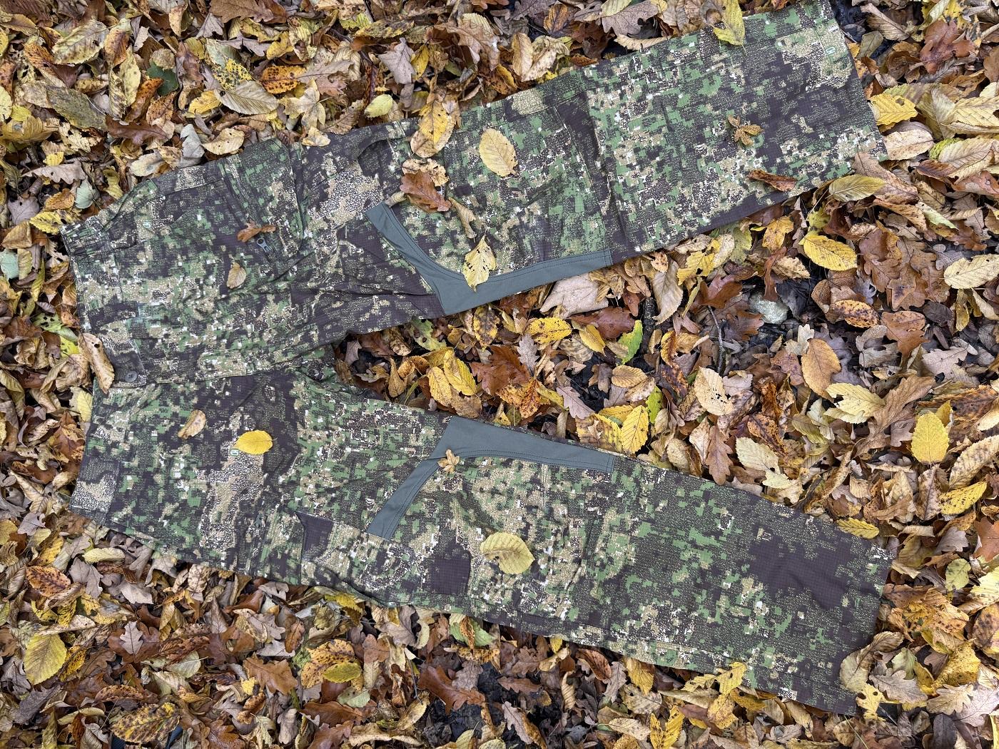 Da liegt die Stealth Warrior Pant ist gebettet auf herbstlichem Laub. Das ist auch gut so, denn auf einer grünen Wiese würdet ihr sie kaum sehen. Die Hose in diesem Tarnmuster ist aus 50/50 Poly Cotton Micro Ripstop Stoff gefertigt und wiegt insgesamt rund 1 kg, also relativ leicht für eine Einsatzhose.