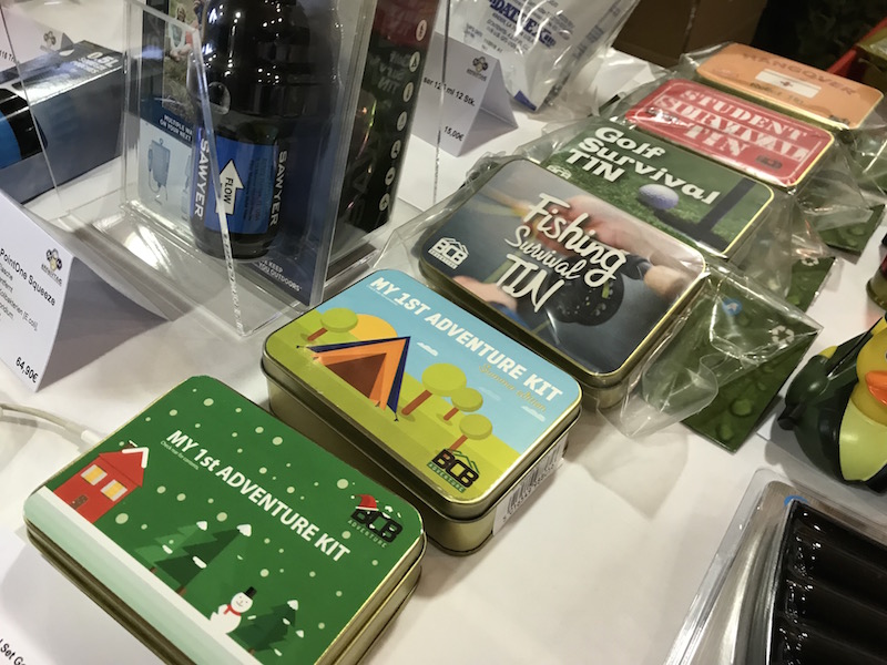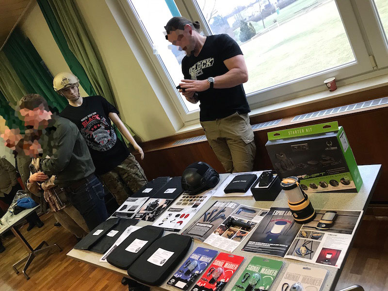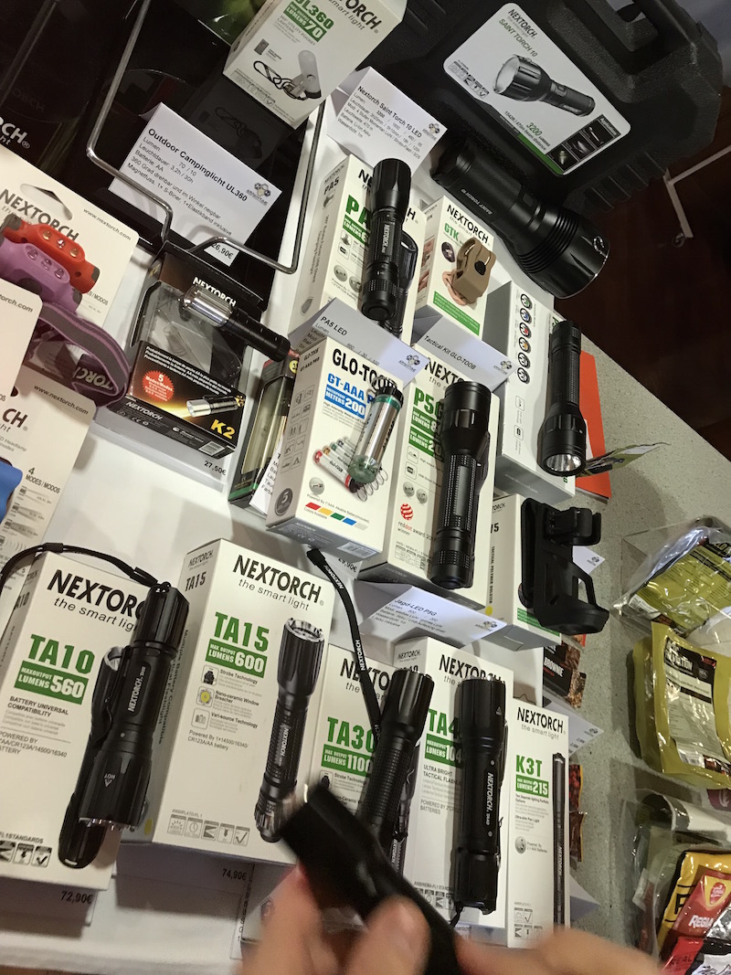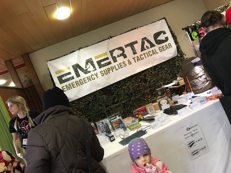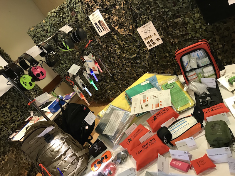 Am Tisch das Angebot von EMERTAC: vorbereitet sein auf Notfälle – und das mit allem Realismus. Erste Hilfe Kits, praktische Helferlein für die Beleuchtung, Trinkrucksack und Gehörschutz für den Schießstand. (Sogar in Pink für die Mädchen.)