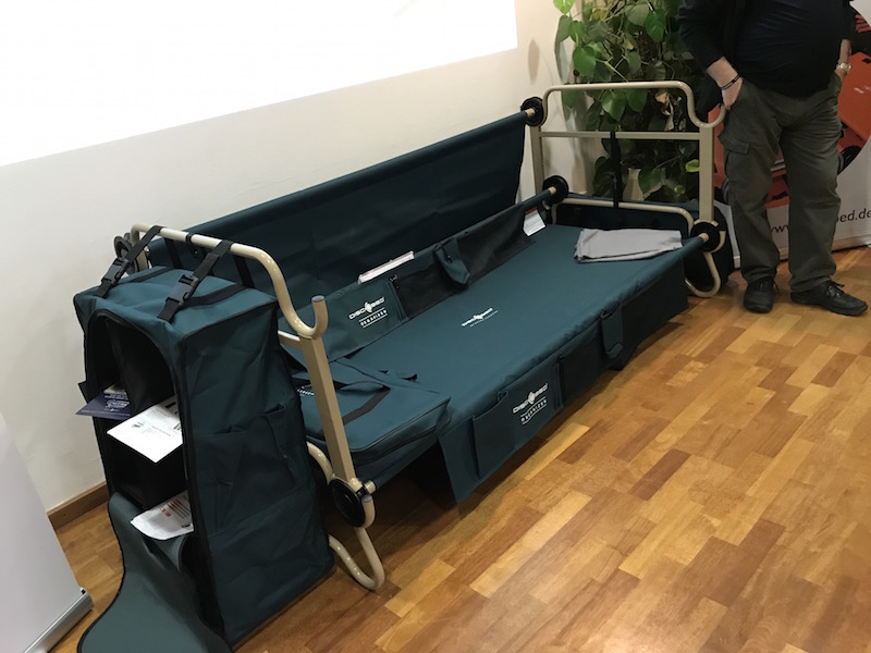 Das dagegen taugt für längere Nächte: Das Disc-O-Bed hat nichts mit der „Disco“ zu tun, ist die Weiterentwicklung des Feldbettes. Große Liegefläche, stapelbar (Etagenbett), multifunktionell und sehr bequem. Das Disc-O-Bed eignet sich perfekt für Campingausflüge in der Natur, als Notbett im Katastrophenschutz, als Gästebett oder für die persönliche Notfallvorsorge. Der runde Rahmen des unteren Betts gleicht Unebenheiten aus und schont den Zeltboden. Stabil, komfortabel und flexibel einsetzbar. Nachts ein Feldbett, tagsüber eine Sitzbank – perfekt für zusätzliche Sitzgelegenheiten! Schnell und einfach aufgebaut dank des patentierten Disc-Systems – kein Werkzeug nötig! HIER gibt es das Bett bei EMERTAC