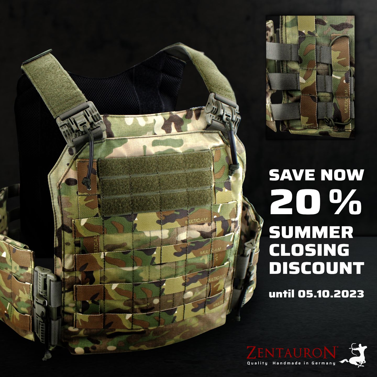 Der Sommer ist heiß: ZENTAURON bietet euch den Sommerschluss mit 20 Prozent Sommerrabatt auf alle Produkte im ZENTAURON SHOP. SCHNÄPPCHENALARM! So günstig gibt es den Plattenträger Vulcan III in verschiedensten Tarnfarben und mit praktischen Schnellverschlüssen nie mehr. Und: Made in Germany.