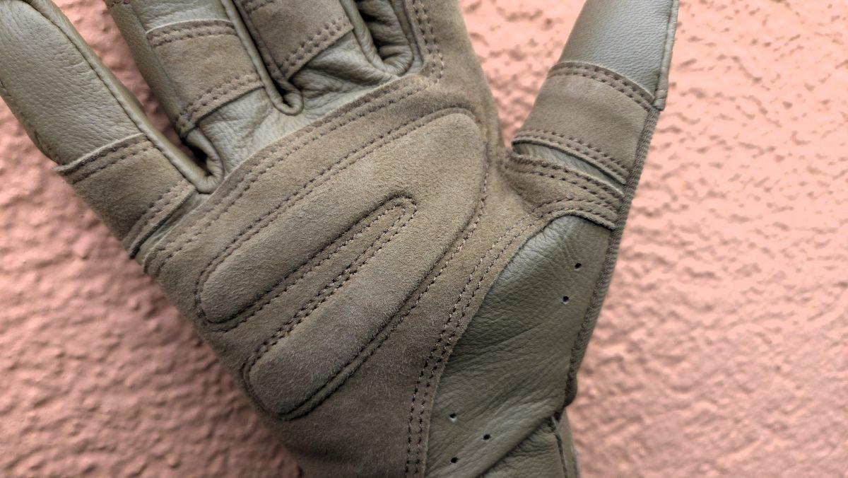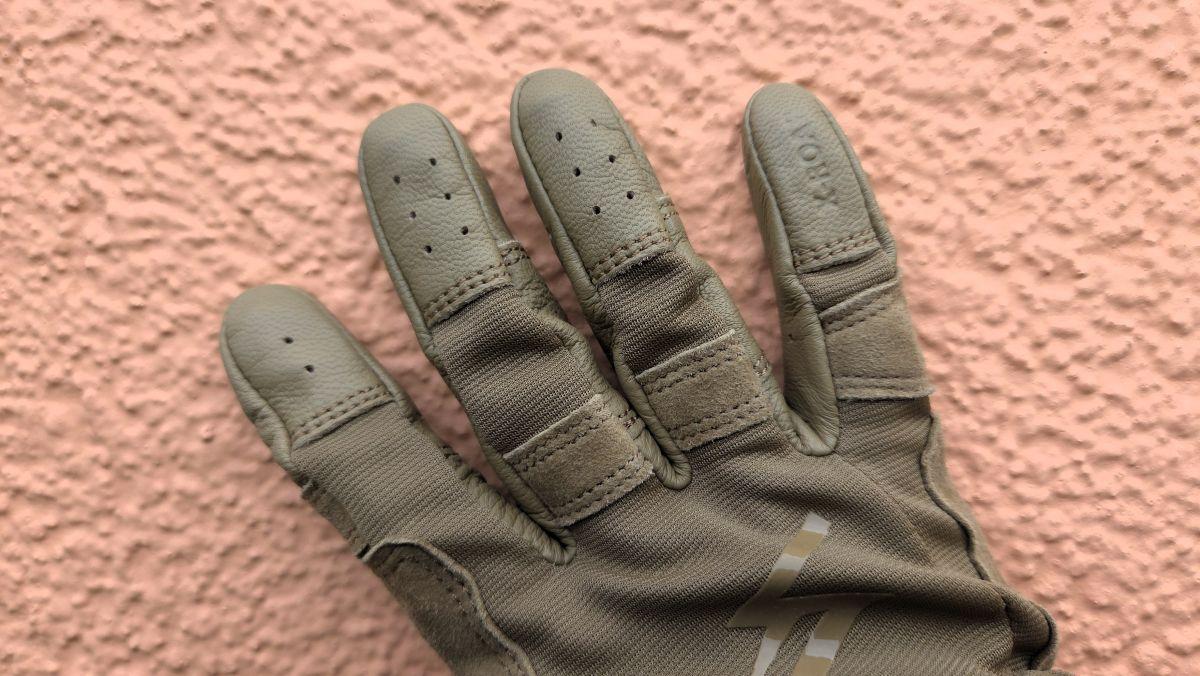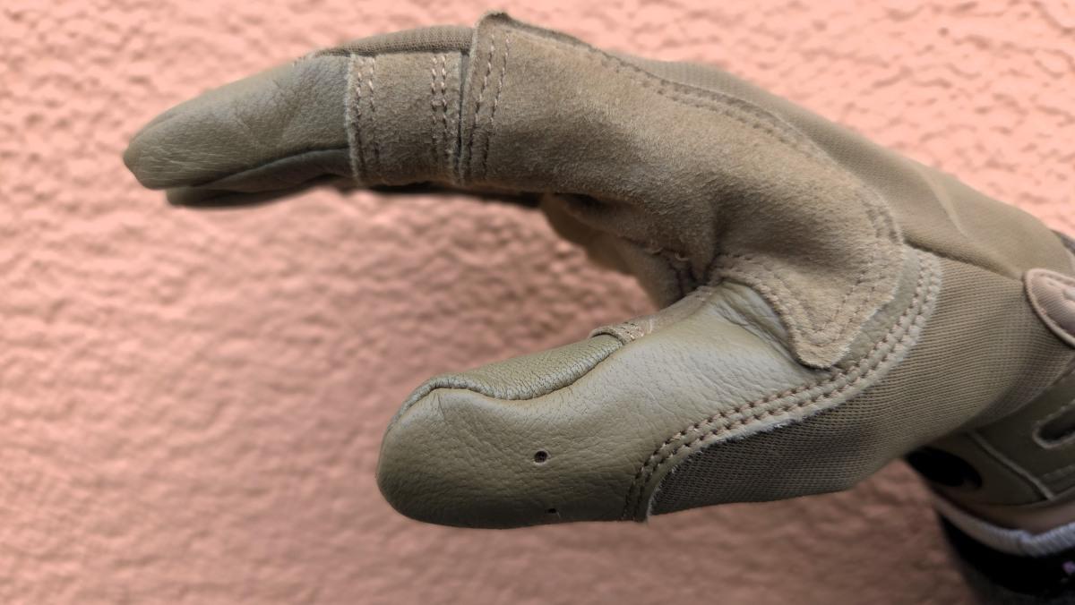 Additionally, leather reinforcements are located at the thumb joint, fingertip, knuckles, and the first finger joint.