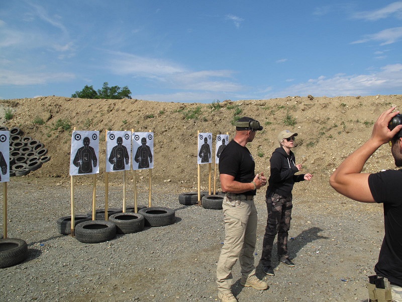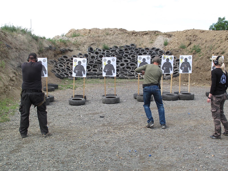 After a few more exercises, the tactical magazine change is introduced. I decide when to reload. This is done, for example, after the firefight when there are no more threats. The idea is to always have a full magazine on the weapon. The participant is taught the proper technique for gripping and how to reload each magazine. Several exercises are quickly shot for this as well. Of course, forced magazine changes are also included in the last exercises. By the way, the instruction is bilingual: the excellent and experienced instructor teaches in Slovak, while the lady on the right translates to German. This works quickly and very well.