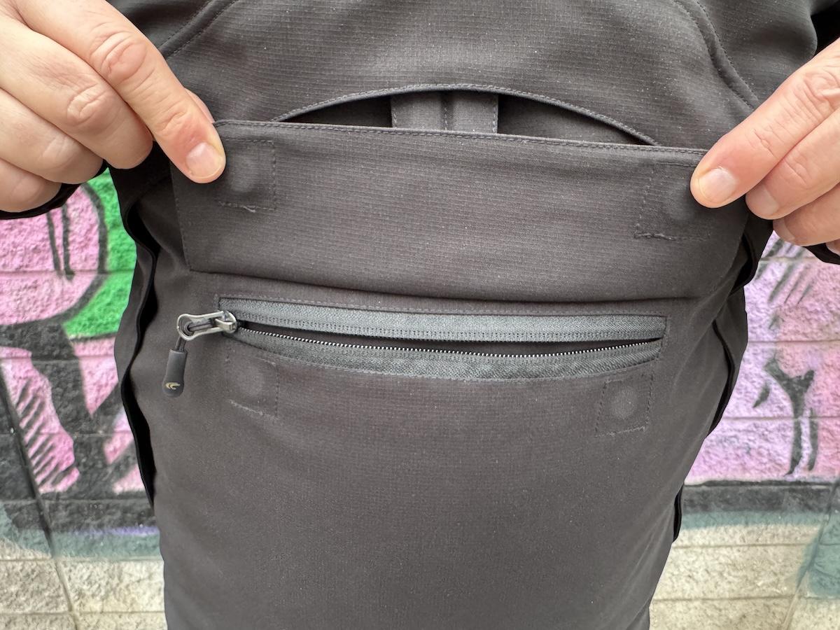 Underneath is an approximately A4-sized compartment secured with a zipper and a flap. We don't need to explain how a zipper works. The two round dots on the flap are actually magnets that, together with their counterparts, ensure that the flap stays securely in place.