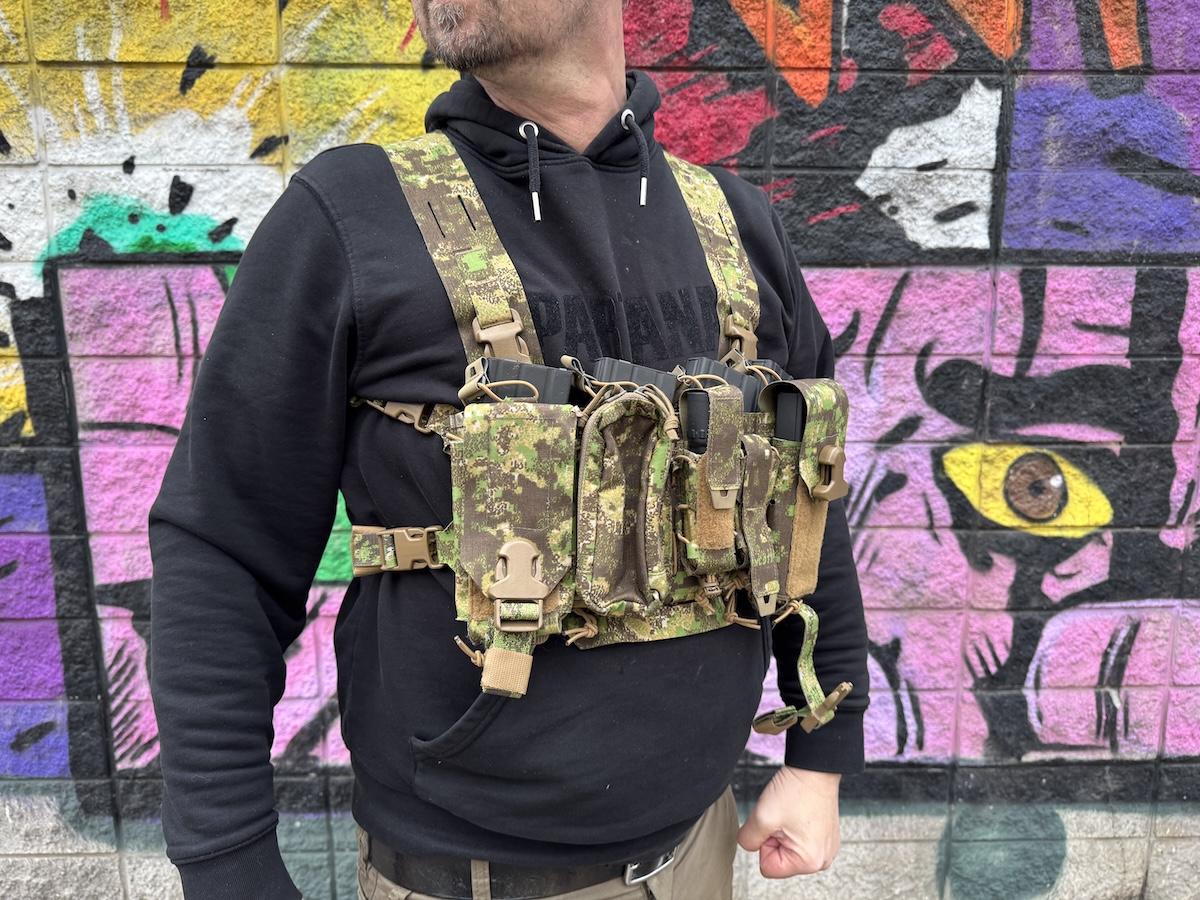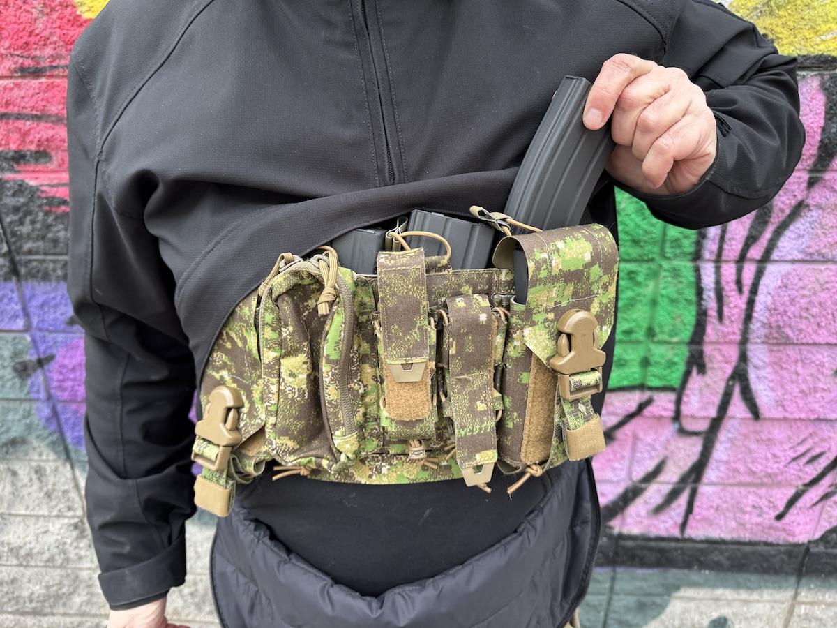 We've chosen a chest rig with five magazines. Clearly visible here in magnificent PenCott GreenZone, the wonderful Thunderbolt Chest Rig from DIRECT ACTION. This gives the user everything they need in a compact format. We chose GreenZone here so we'd have a nice contrast with the black anorak.