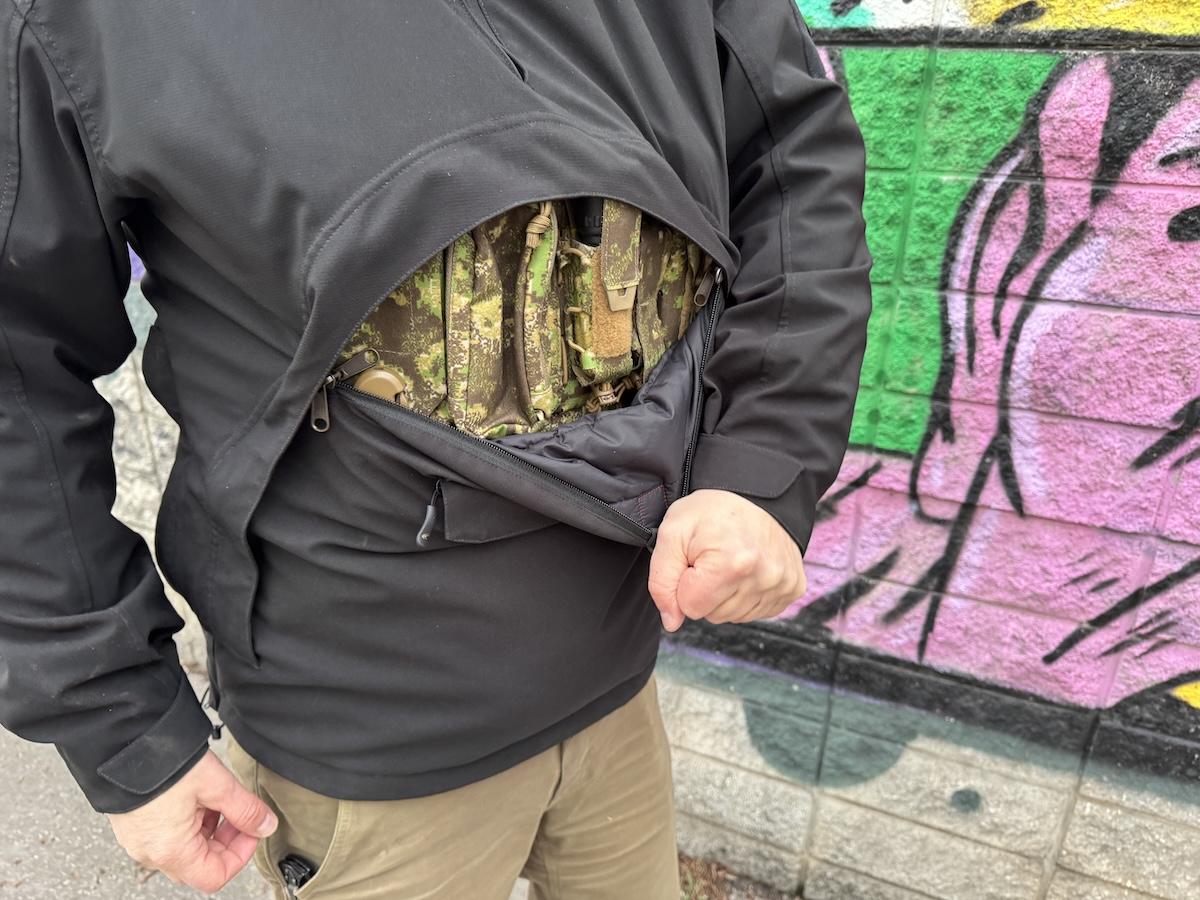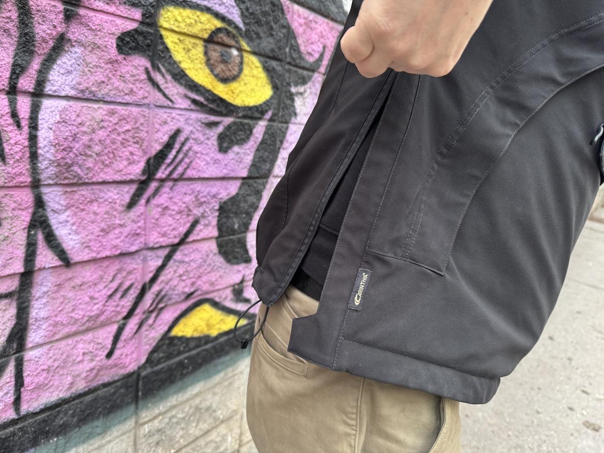 On the sides, right and left up to chest height, the CARINTHIA Tactical Anorak has two slits that are, so to speak, multifunctional. For the professionals among you, they make wearing a holster easier. The jacket splits and this prevents it from bunching up over the holster and sitting too high, which would be extremely impractical when it's cold. At the same time, the slit is an air conditioning system and an entry aid.