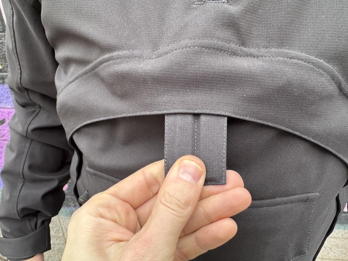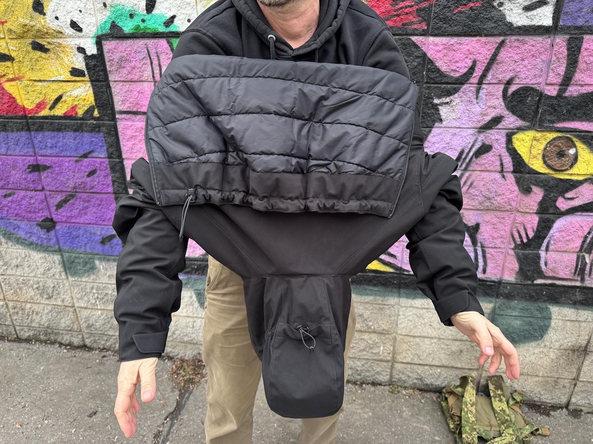 View from behind. You can see a large hood and otherwise everything pulls down in one go and closes at butt height. We always wear the CARINTHIA Tactical Anorak somewhat gathered so that we have our pants pockets free. Also because the anorak has no pockets for hands. So we wear "American gloves," hands in the pants pockets, so our fingers don't freeze.