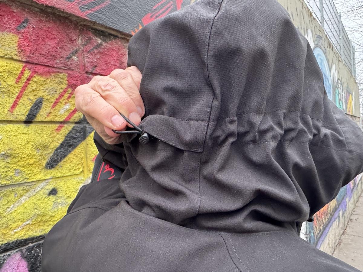By the way, the collar with the hood down is nice and high and protects the neck. If you pull the edge properly, the wearer can disappear into the anorak up to the tip of their nose. In winter, it can still be worthwhile to wear a scarf or neck gaiter underneath.