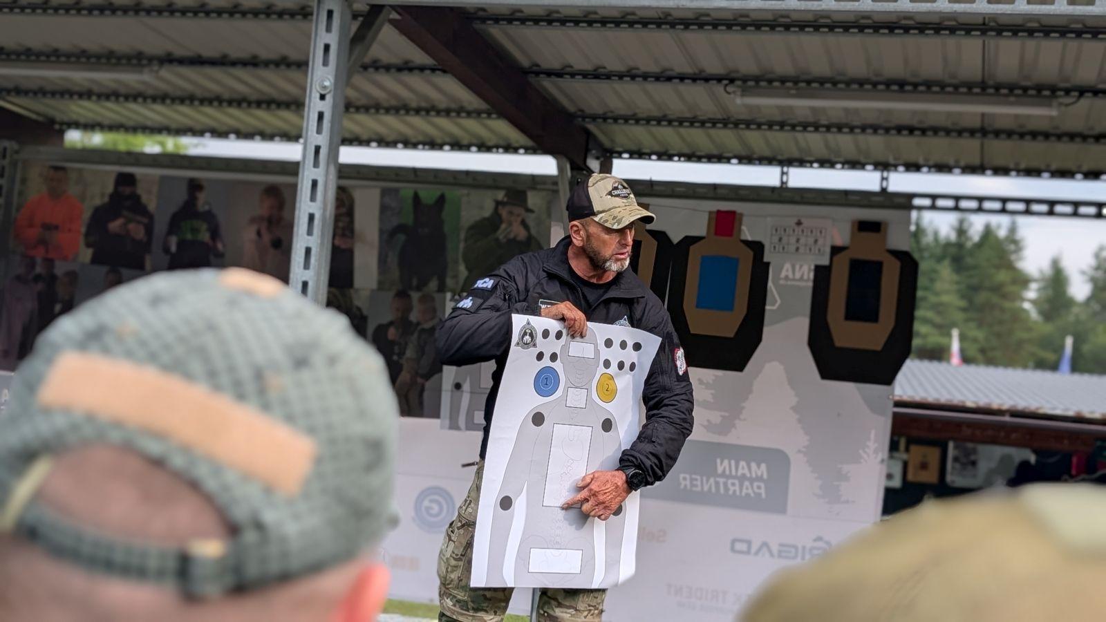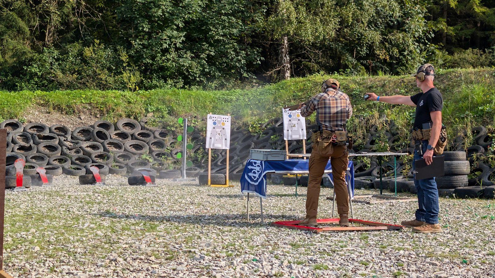 After the welcome speech, there is also a safety briefing. New this year – most of the possible targets are hung up and Gabo briefly explains how to shoot at them. Hardly any other competition offers as many different targets as this one. From paper to cardboard to steel. Everything is there, of course. But the paper targets were also subdivided, including photorealistic targets that had to be identified to determine whether the person posed a threat or not, as well as other targets with special hit areas.