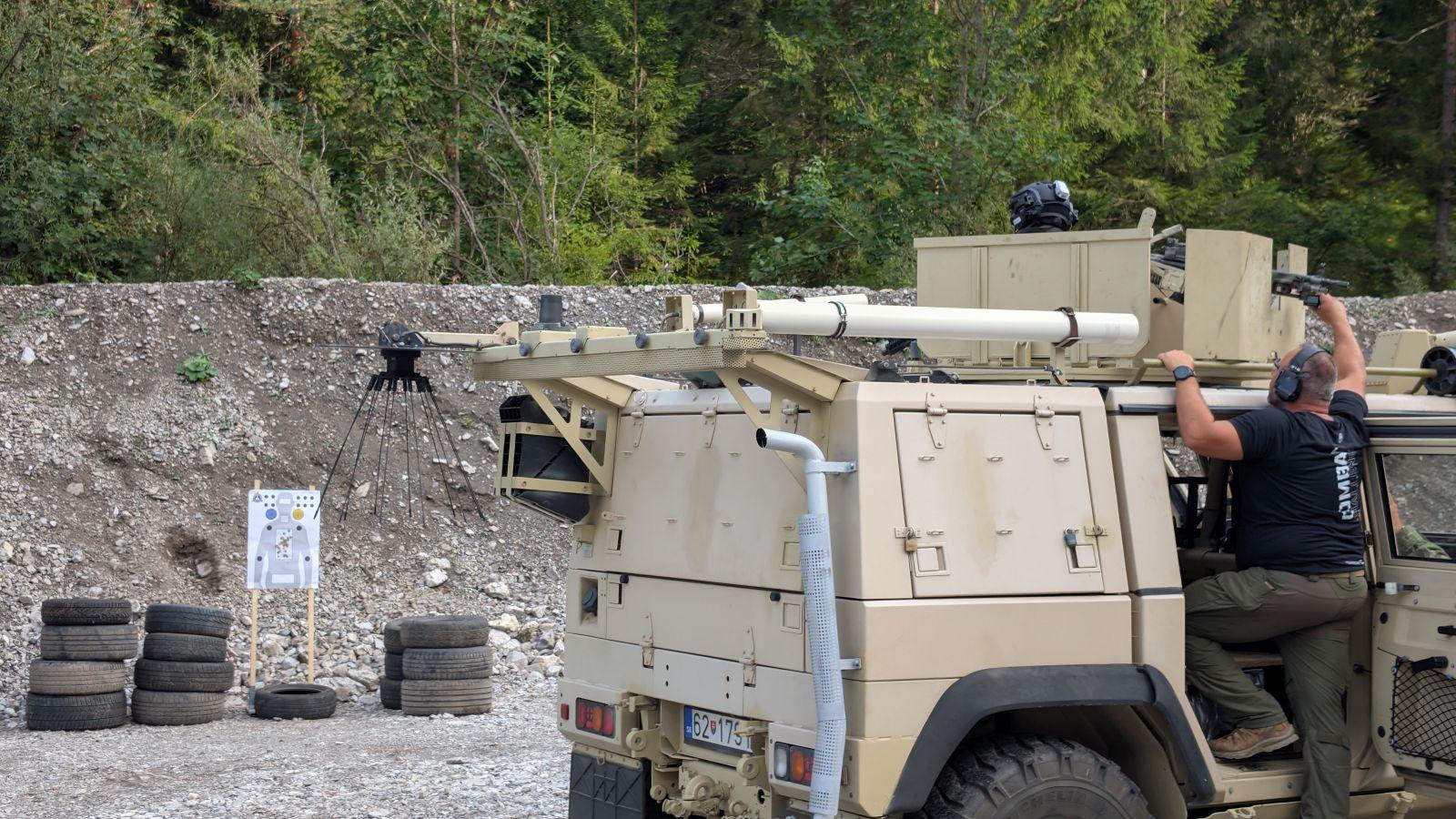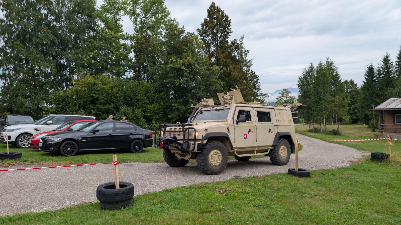 Before we know it, we're already on our way to the range. It's only about a three-minute drive from our accommodation, and as soon as we park, a military vehicle comes towards us. We'll see this later on a stage and it's provided by the Slovakian special forces.