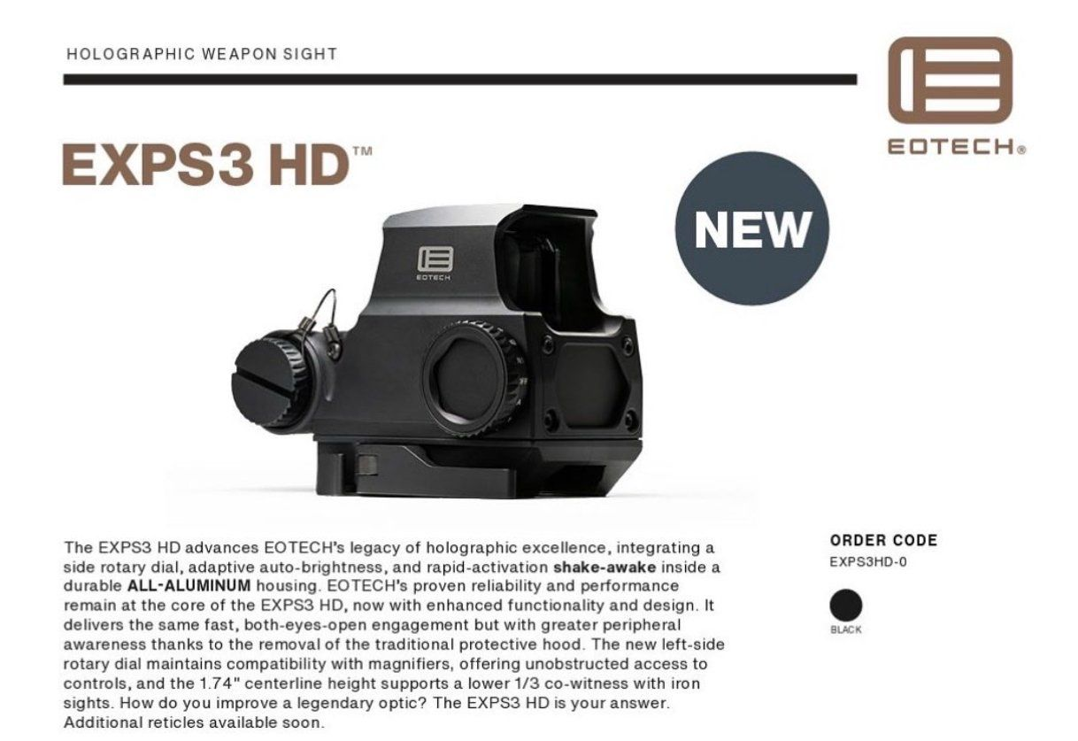 EOTECH is set to launch its new EXPS 3 HD holographic sight, featuring a redesigned housing and a rotary switch for operation instead of buttons, similar to AIMPOINT. It retains the mounting of the previous model and includes a Shake Awake function, enhancing usability and functionality. Technical specifications are also provided.