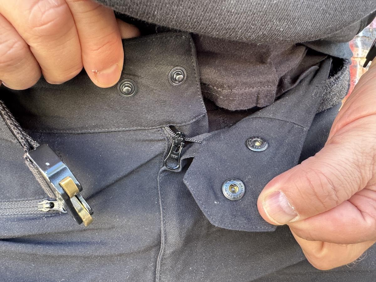 The waistband closes twice with snap buttons; safety first. You reach the best piece with a normal zipper.