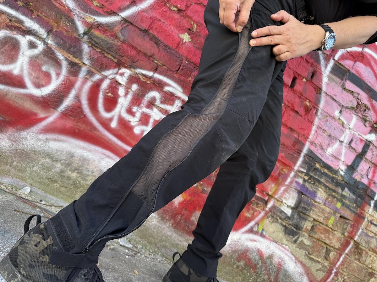 Or completely. That is actually the built-in air conditioning. And it is extremely practical. Lined with mesh, the wearer can decide how much air they need at the legs. They can thus prevent overheating in the pants while hiking up a mountain or control the temperature range in the field: Central Europe, over 30 degrees – 30 cm open; Norway, under 15 degrees, everything closed. This makes the pants truly versatile in transitioning between areas of use.