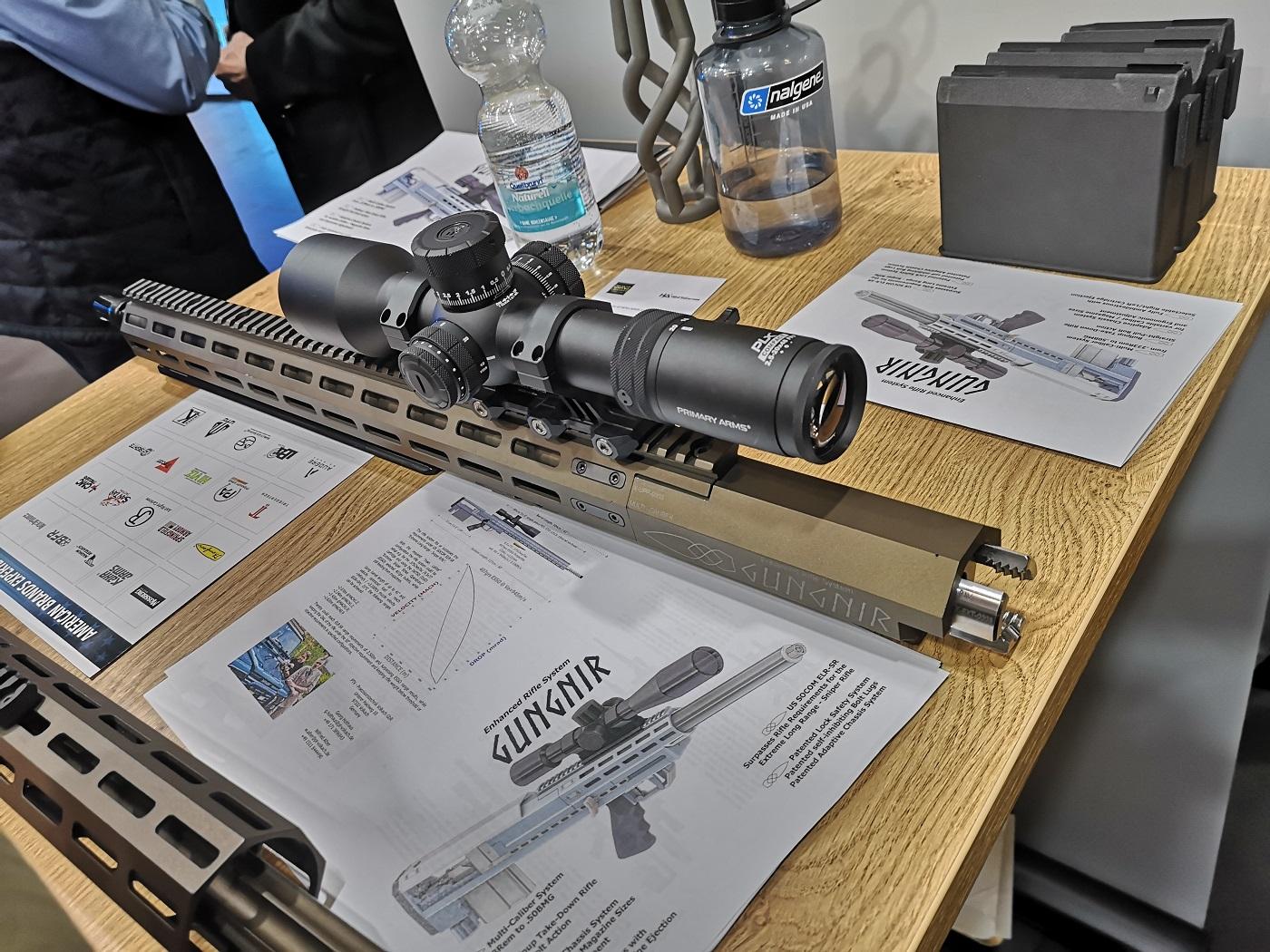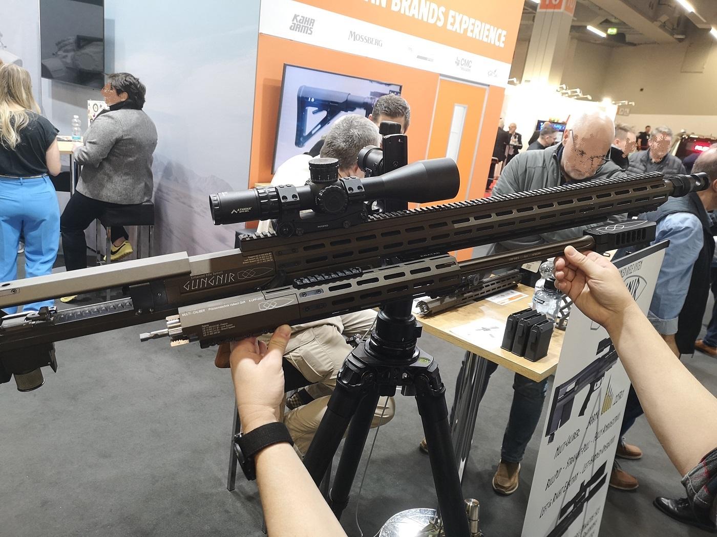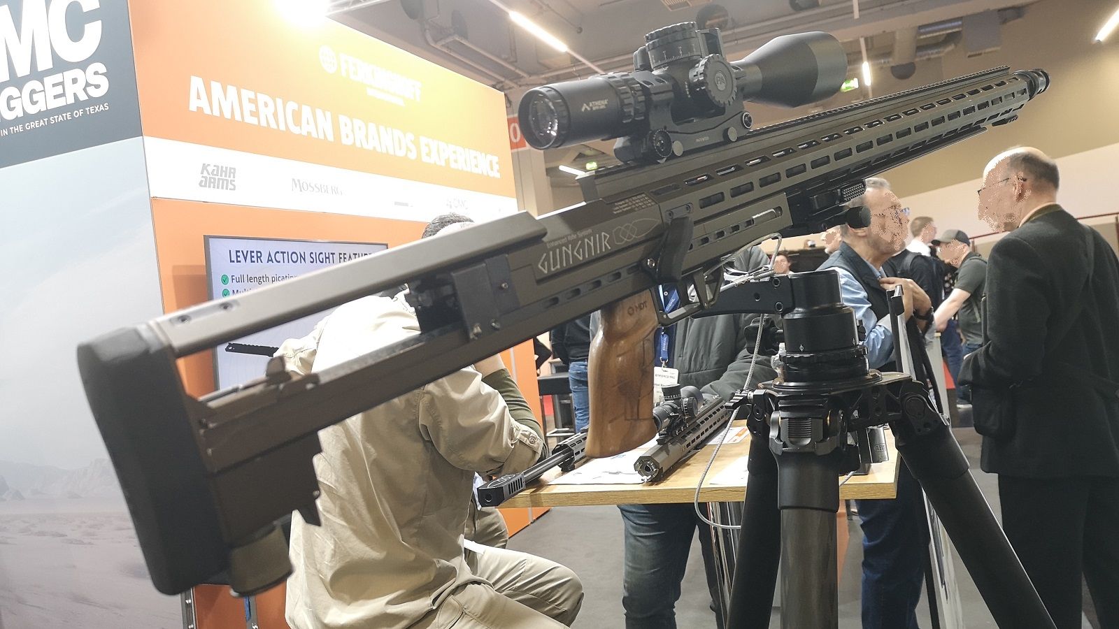 At the FERKINGHOFF stand, the GUNGNIR Bullpup sniper rifle prototype was showcased, featuring a quick caliber change by swapping the barrel and bolt in under five minutes. The .50 BMG variant was on display, alongside a 338LM barrel with a large muzzle brake. Enthusiasts hope for this innovative design to enter series production.
