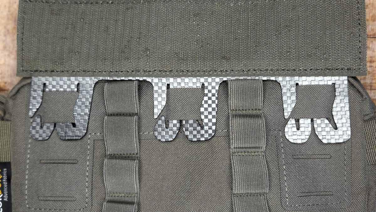 The back of the Plate Carrier Pouch VL is equipped with five elastic insert loops, laser-cut slots, and side Cordura loops.