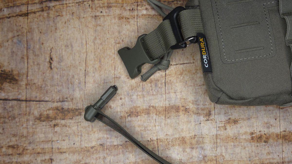 The attachment of the length-adjustable strap to the Plate Carrier Pouch VL is made possible by the so-called snap hook from Woojin Plastic. A WJ closure is used for quickly detaching the bag.