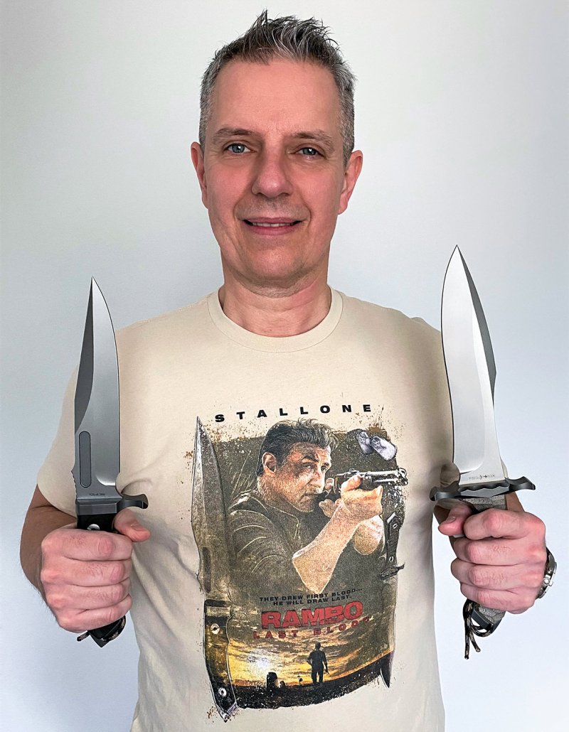 "Size matters," that was always clear with Rambo. Now it's also German Pohl Force quality. Dietmar Pohl with Sly on the chest and his two knives in hand.