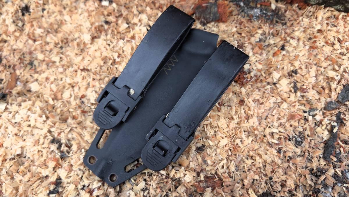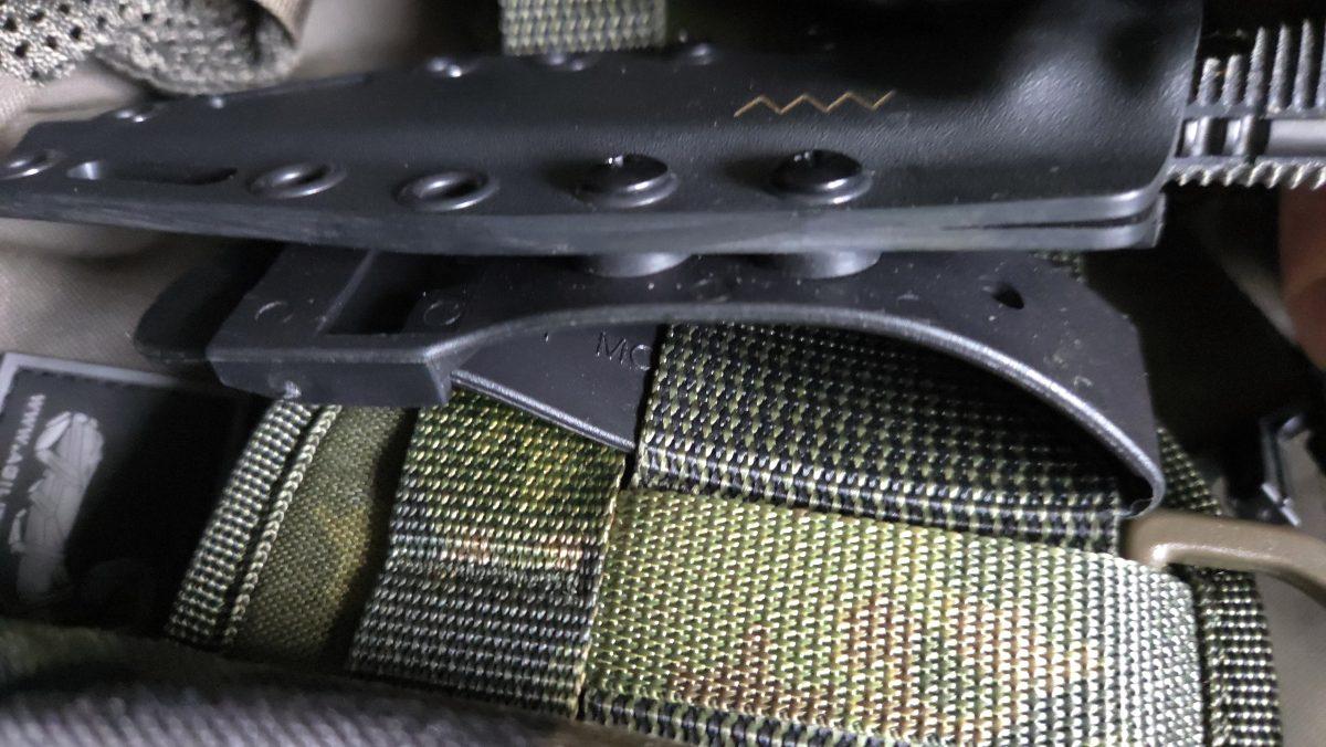 Two short attachment straps from 2M for MOLLE/PALS are screwed onto the Kydex sheath. They can be attached to any compatible duty belt or piece of equipment.