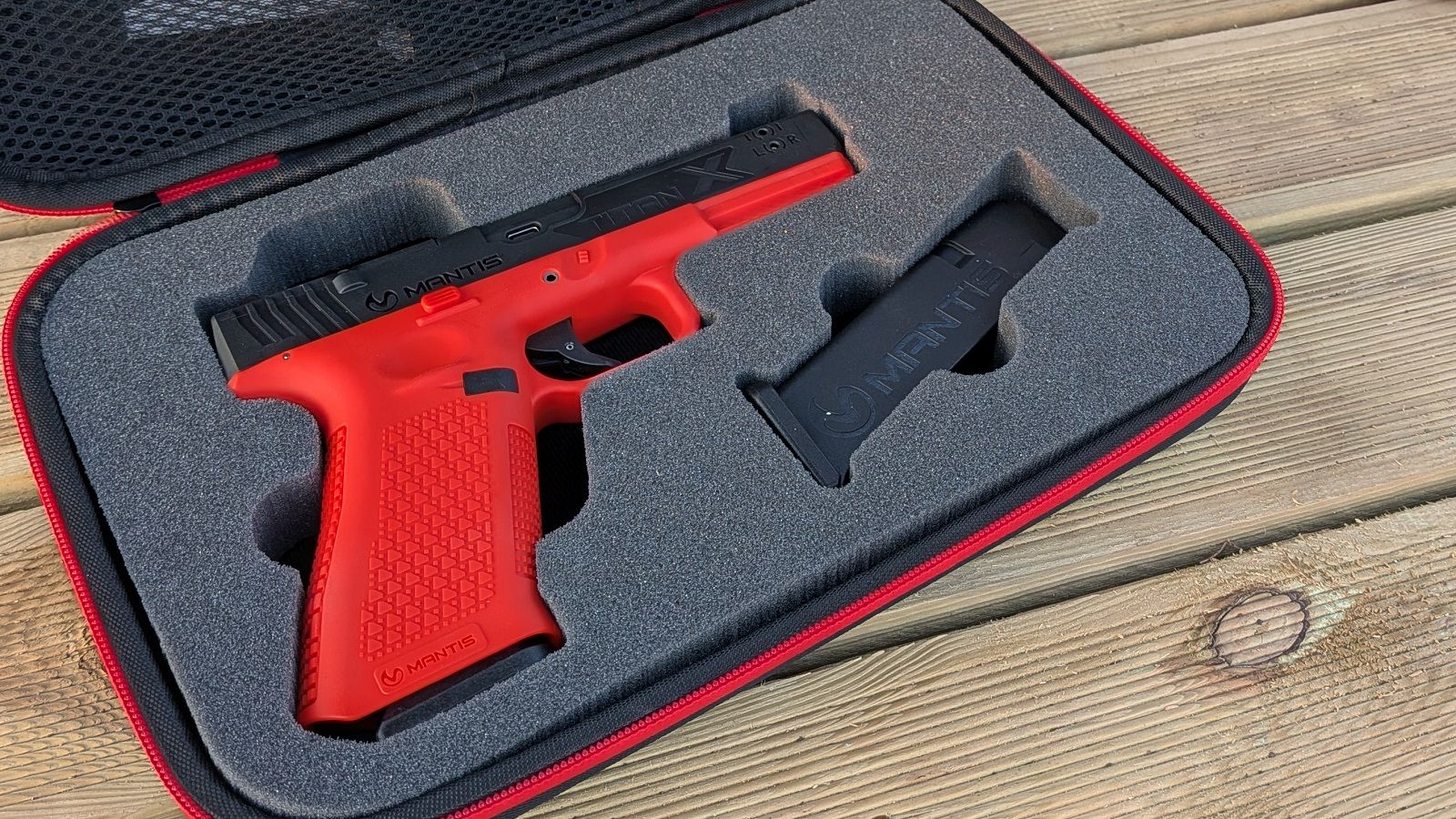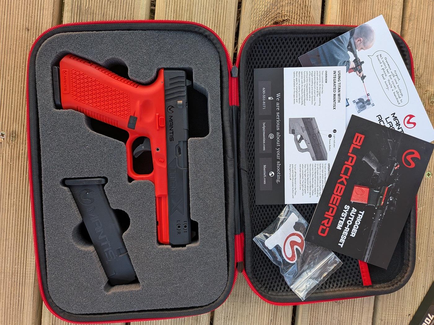The Titan X from MANTIS is a training device for handgun training. It comes in the form of the Glock 17 with a built-in red laser and the MantisX 10 system. The high-quality soft case contains the following items: