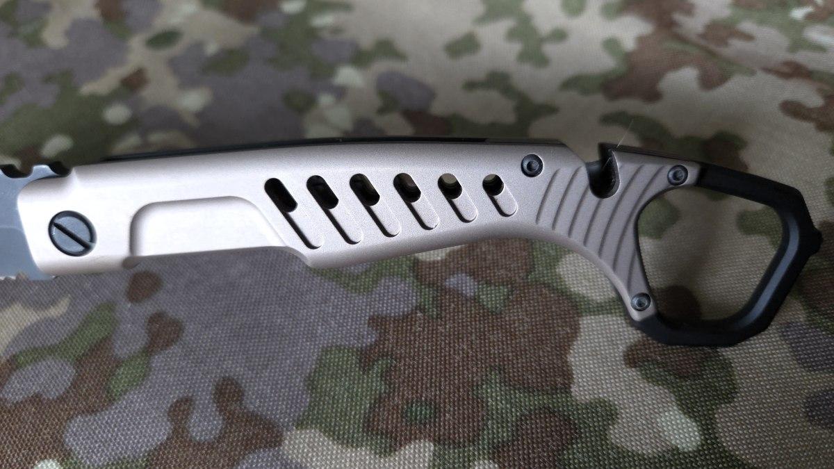 The slender handle is made from a material referred to by EXTREMA RATIO as “Anticorodal,” an alloy of aluminum, magnesium, copper, and manganese, and is anodized. A tactical mud color was chosen. The cutouts in the handle scales reduce the weight of the MH-Stealth and ensure a secure grip, even with mud, sweat, moisture, or blood on the handle.