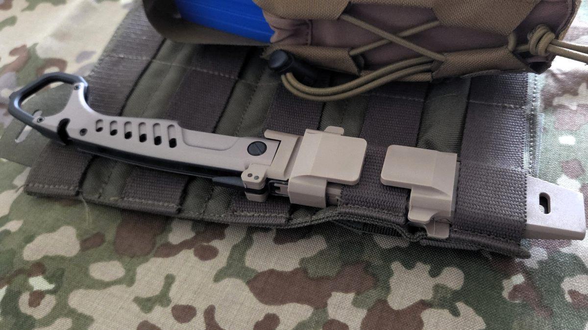 The knife can also be drawn from the sheath while attached to a plate carrier by pressing with the palm. Push against, grab the MH-STEALTH, and pull out. It's all a matter of practice.