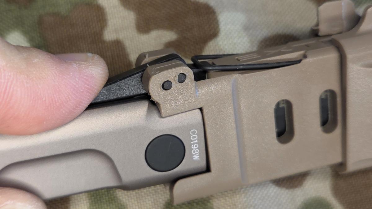 The knife clicks securely into the sheath and is stored safely within it. The necessary cutout on the knife is present.