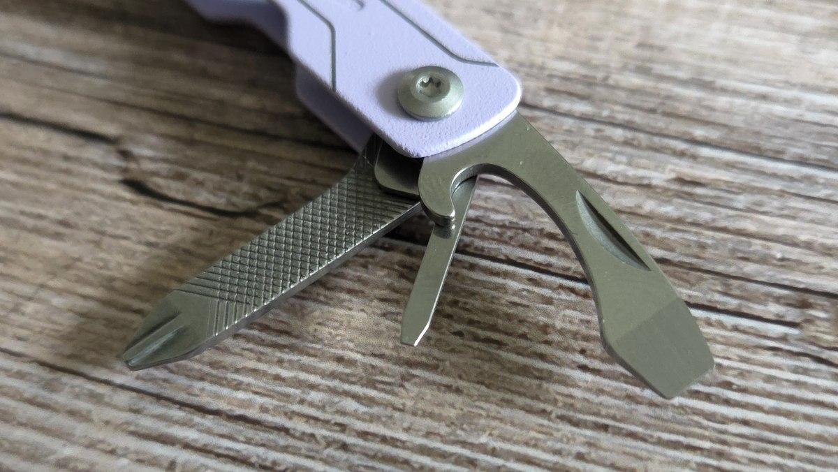 The micro-tool is also equipped with tweezers, a flat screwdriver, a bottle opener, a Phillips screwdriver with an integrated file, and a screwdriver for eyeglass screws.