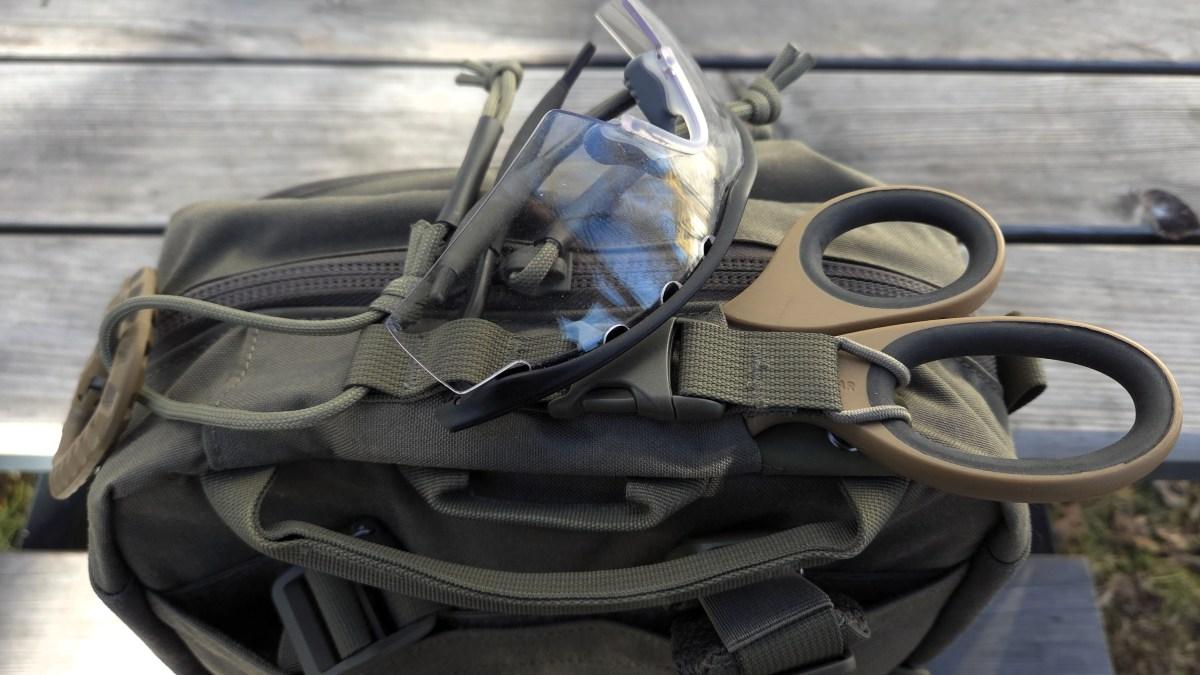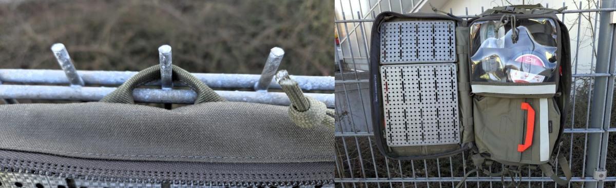 On the top lid there is a scissors pocket with a Fastex buckle and paracord. Various models of rescue shears can be stored in it.