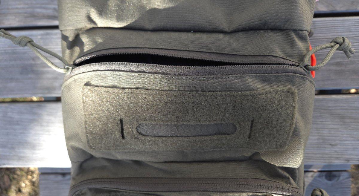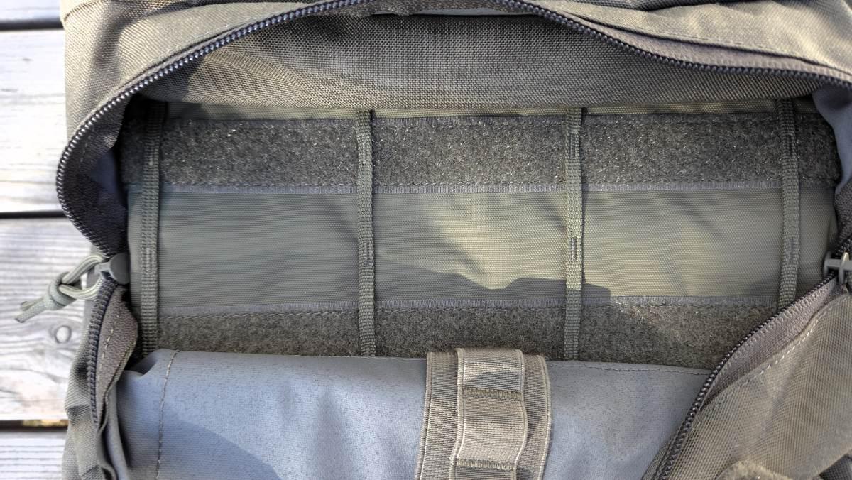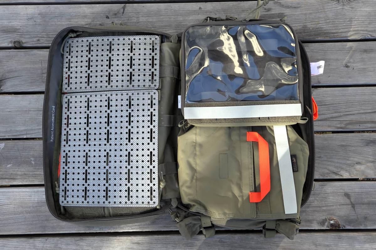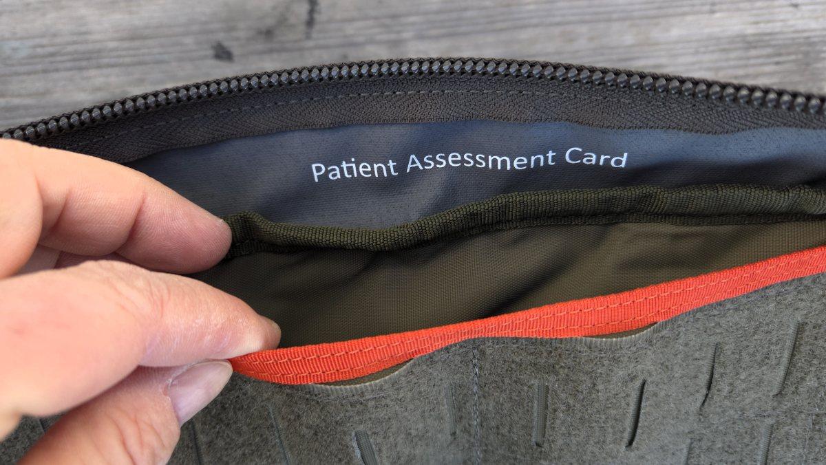 On the inside, behind the loop Velcro with the MOLLE field, there is a marked slip pocket for patient cards.
