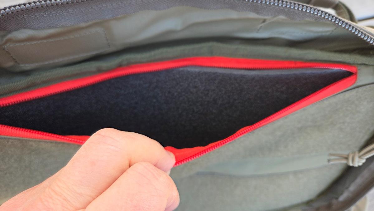 On the other side, behind the Velcro, there is a document compartment located behind the red zipper. Inside this compartment there is also a stiff foam plate that cannot be removed.